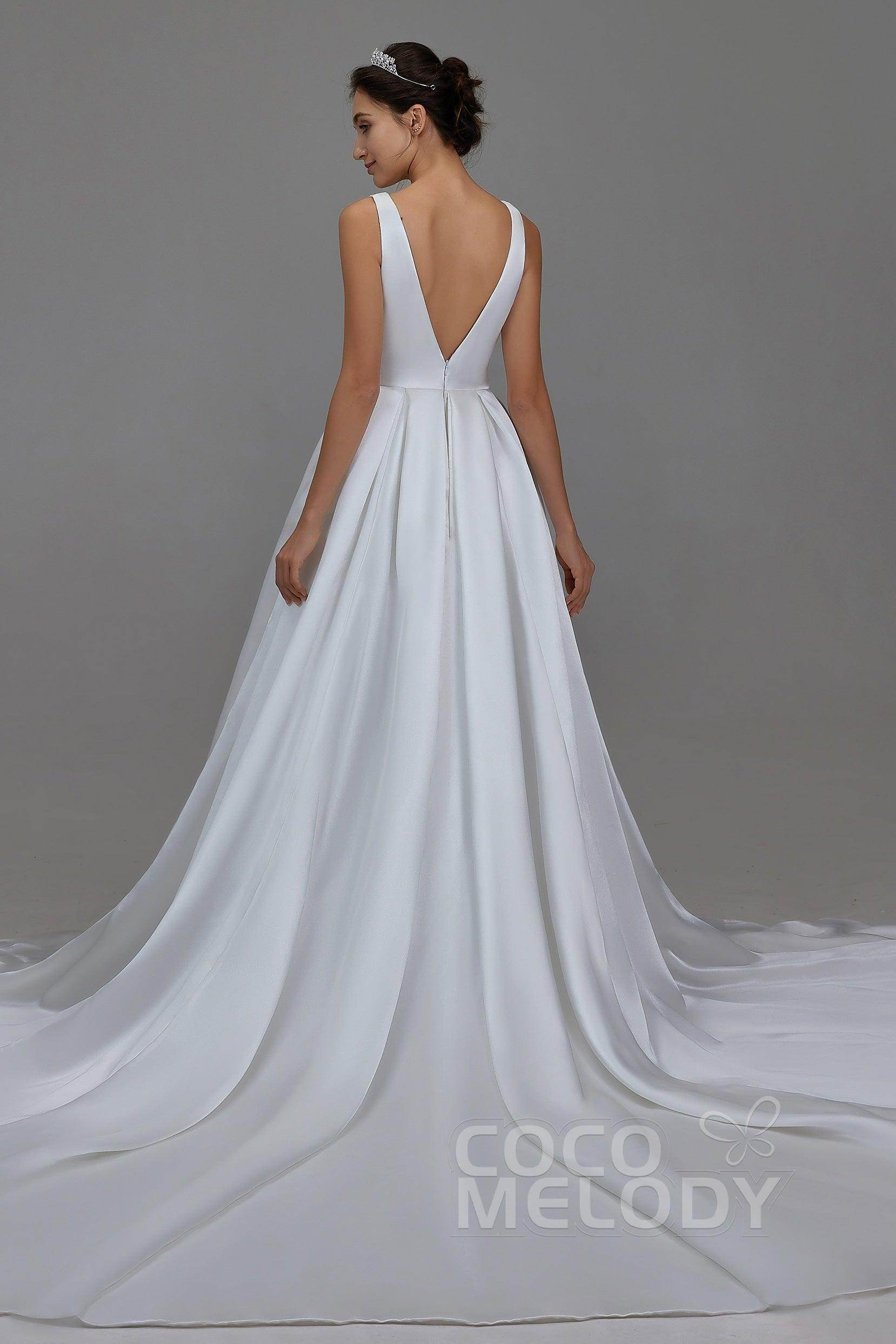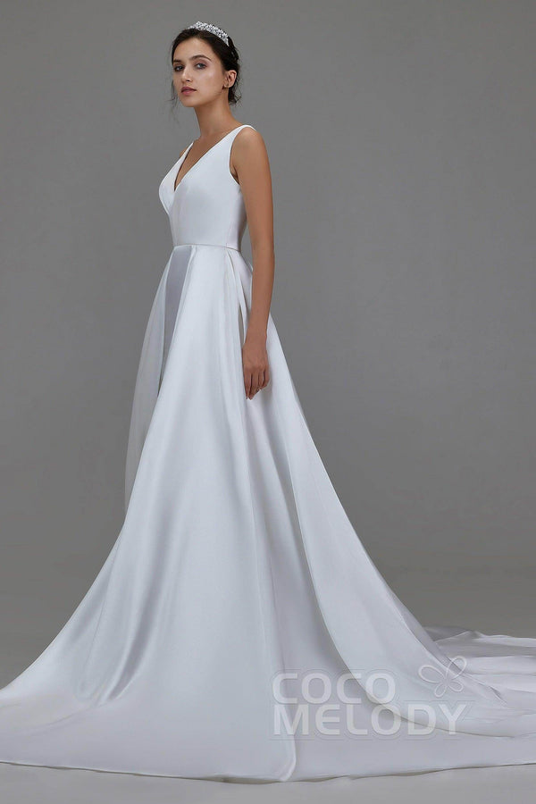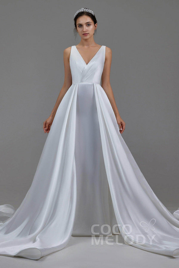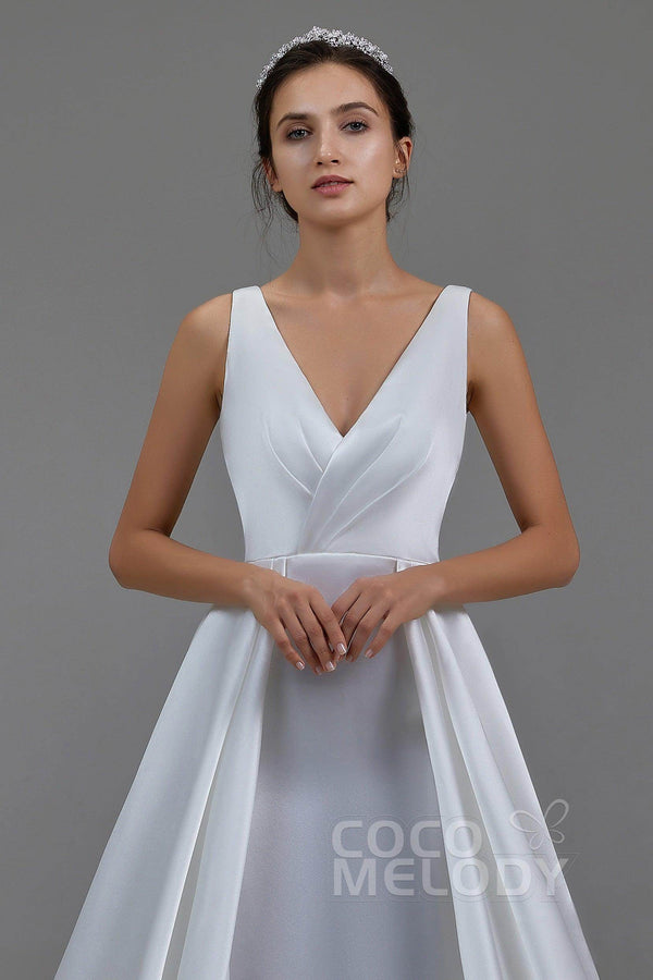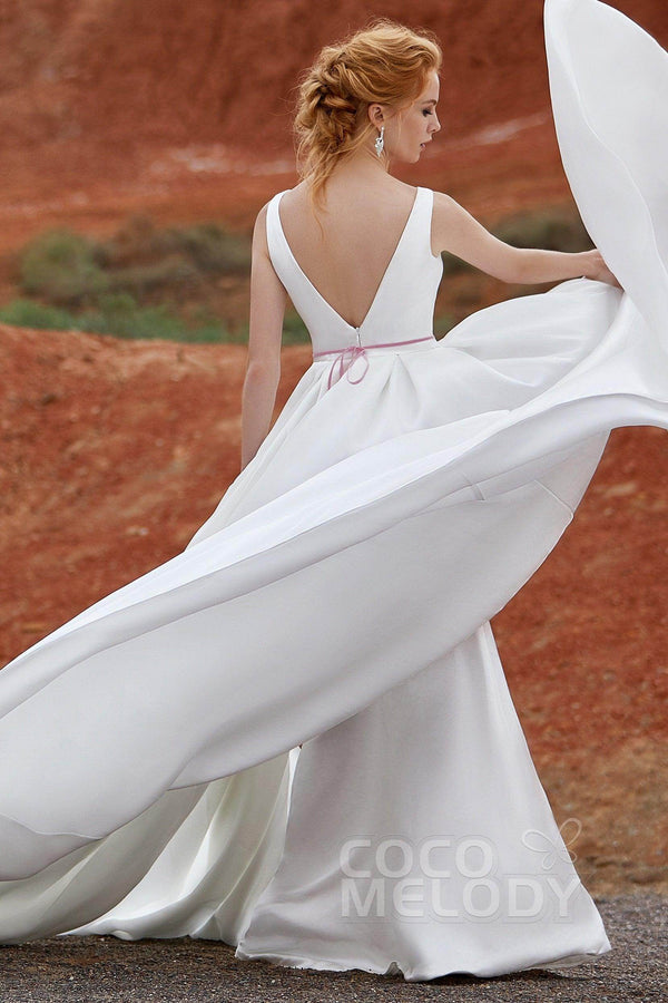 Introducing the MARGARETTE wedding dress—an embodiment of minimalist elegance. Crafted from luxurious pearl yarn in soft ivory, its V-neck and sleeveless design highlight your figure. With pleating and sashes, this A-line gown with a chapel train is perfect for church , hotel, or hall weddings. Embrace timeless charm!