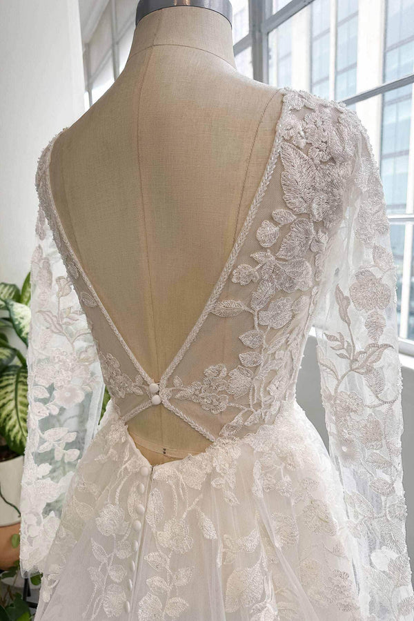 Elevate your wedding style with the TARAJI dress by Classic. This stunning ivory/nude pink A-line gown features a flattering V-neck, long sleeves, and exquisite appliqués. Perfect for garden or outdoor venues, its customizable fit, court train, and sparkling details ensure you shine beautifully on your special day!