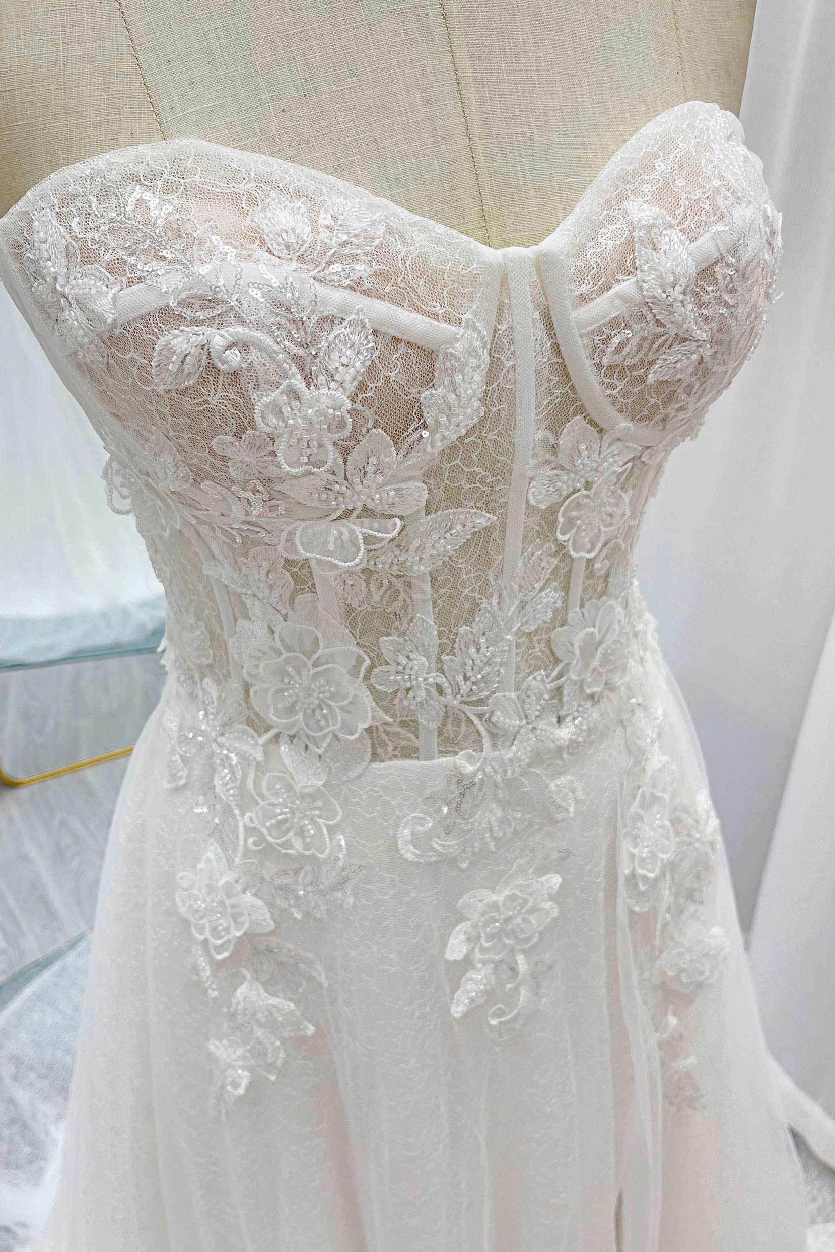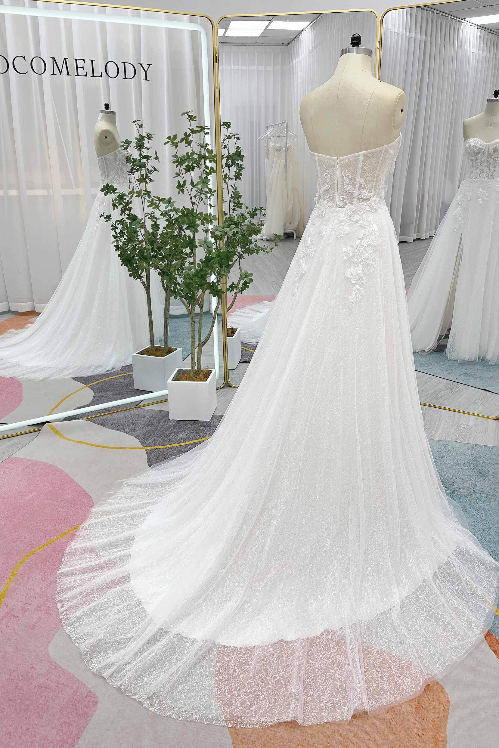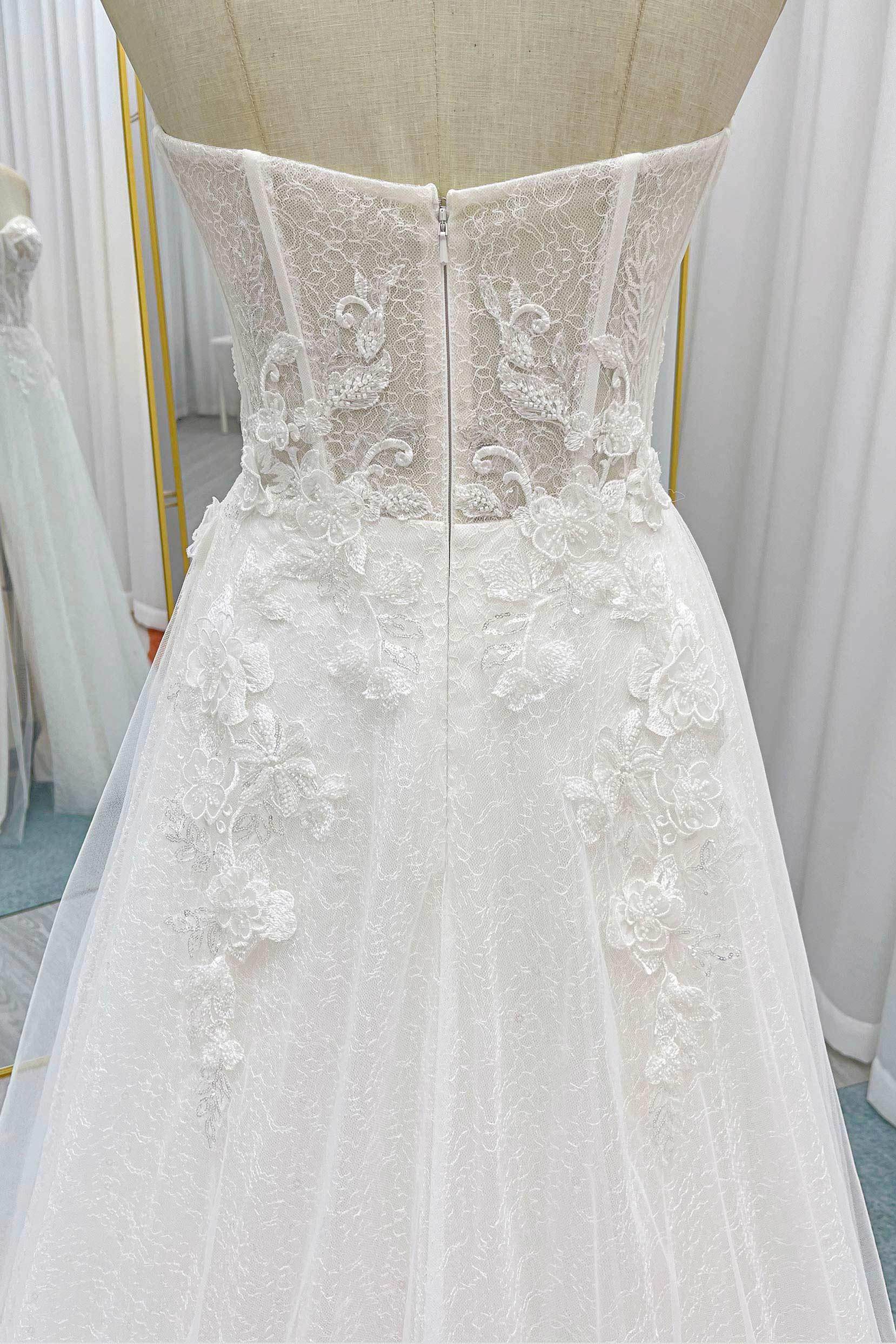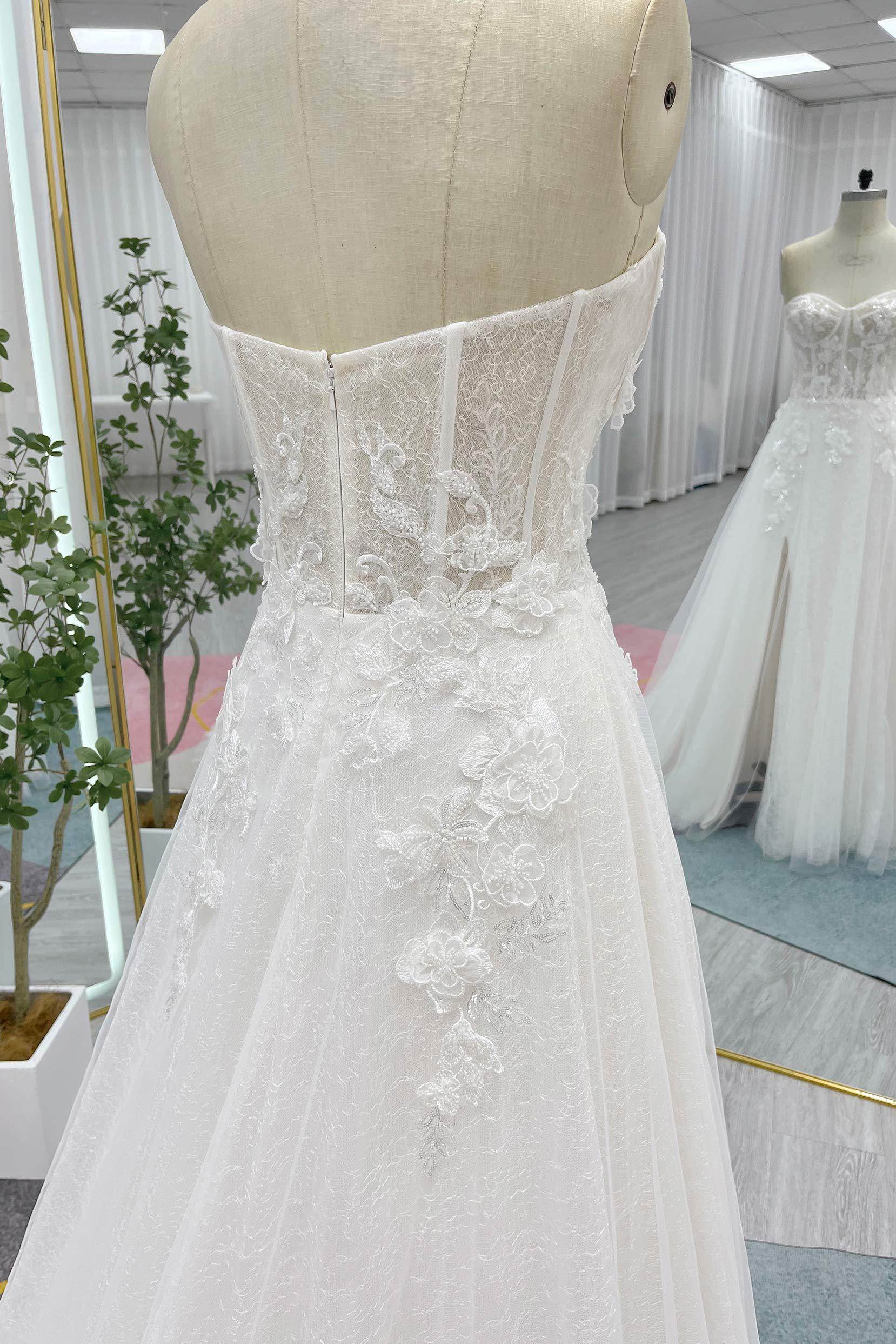 This modern wedding gown features a strapless bodice with built-in cups and boning for a flattering silhouette. Adorned with delicate appliques and intricate beading. The A-Line silhouette crafted from lace and tulle offers timeless beauty, with a slit in the skirt adding a contemporary touch to the design.