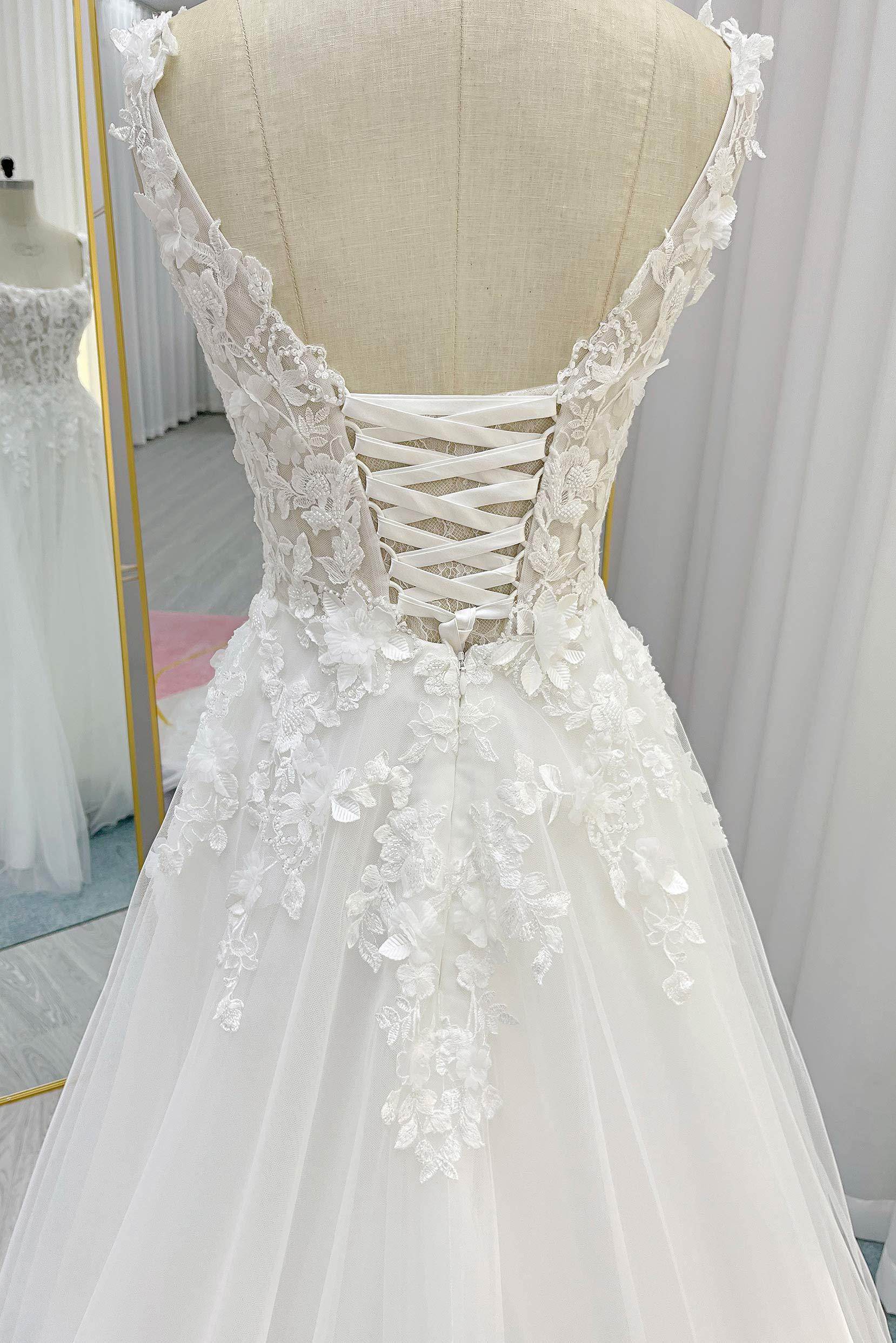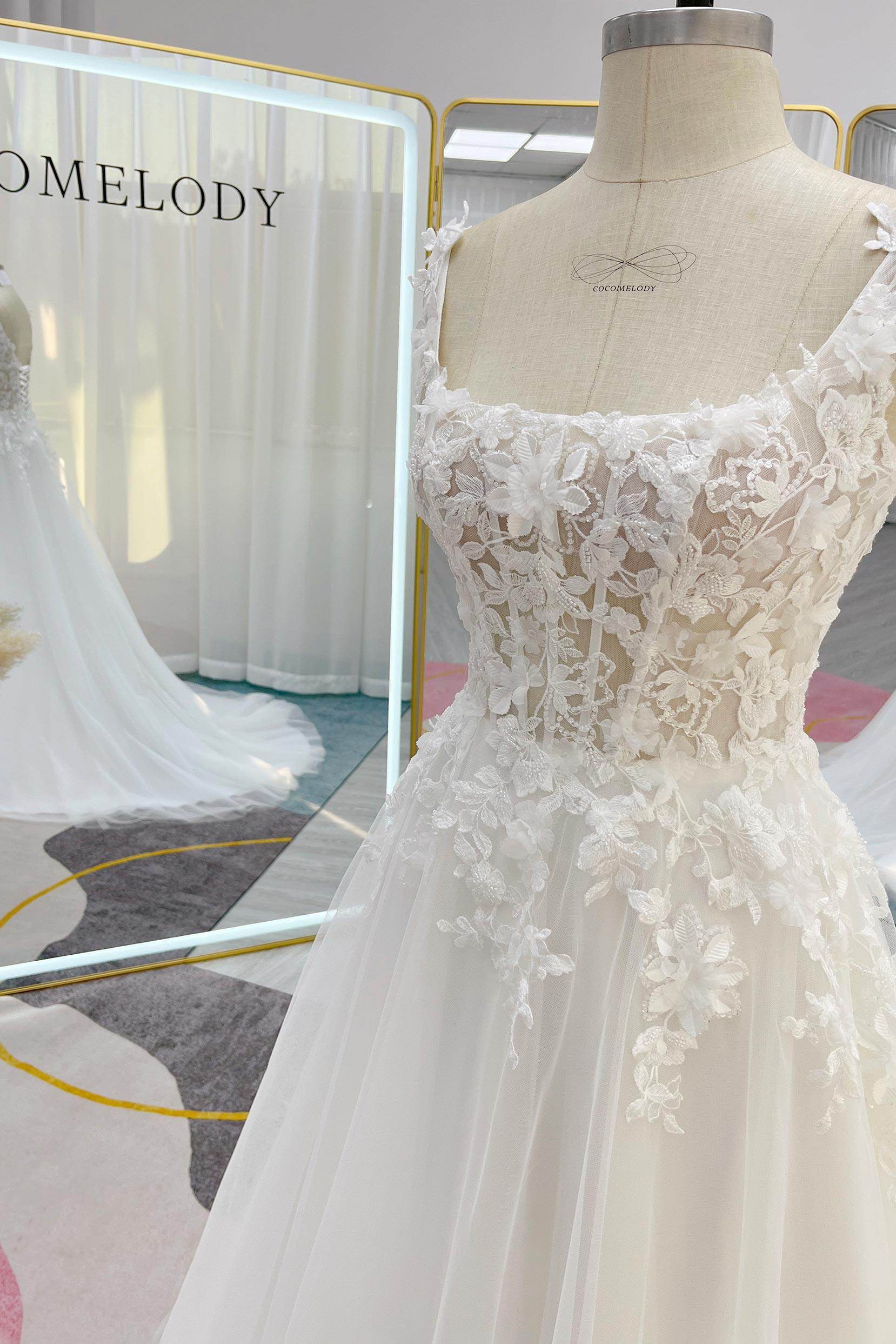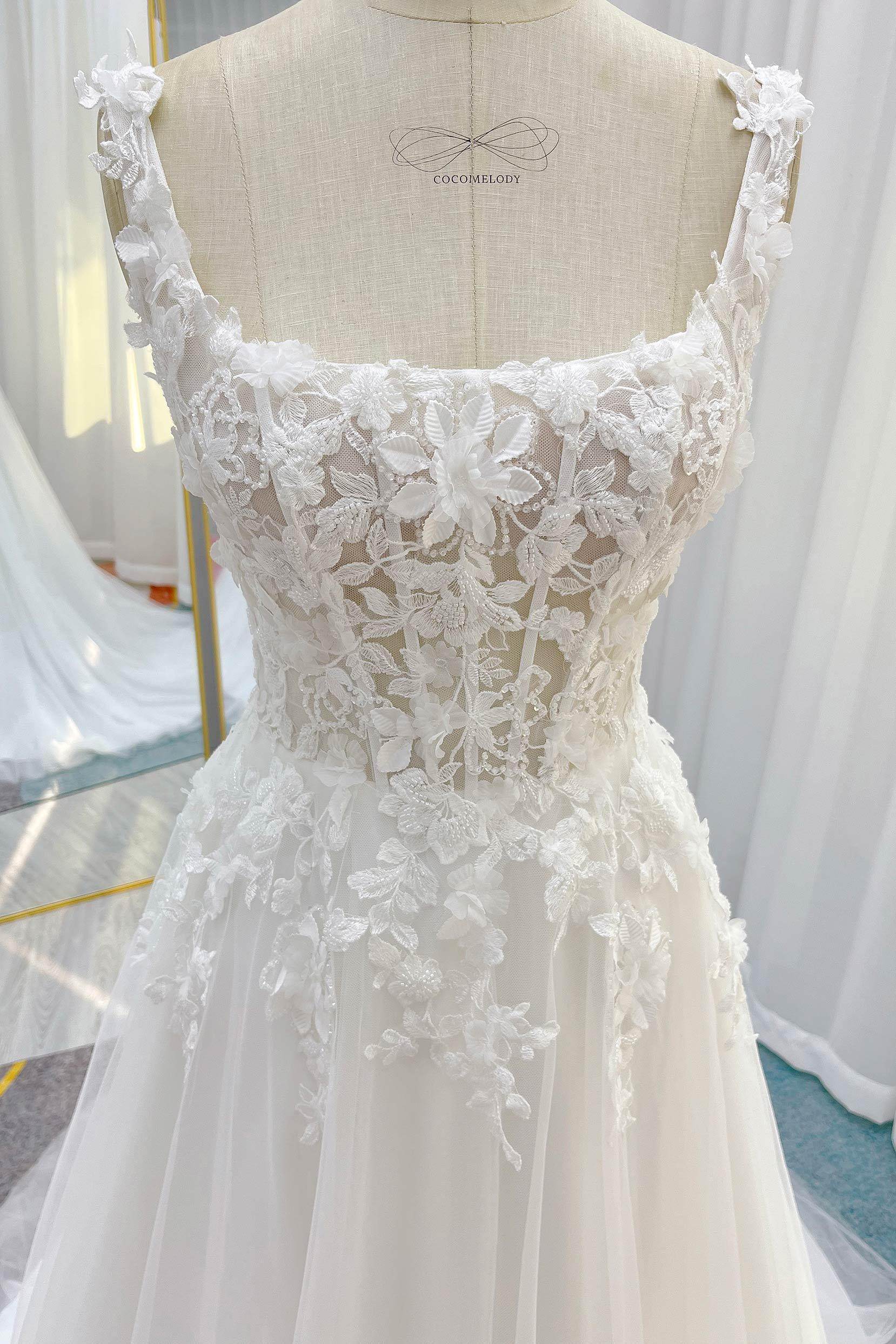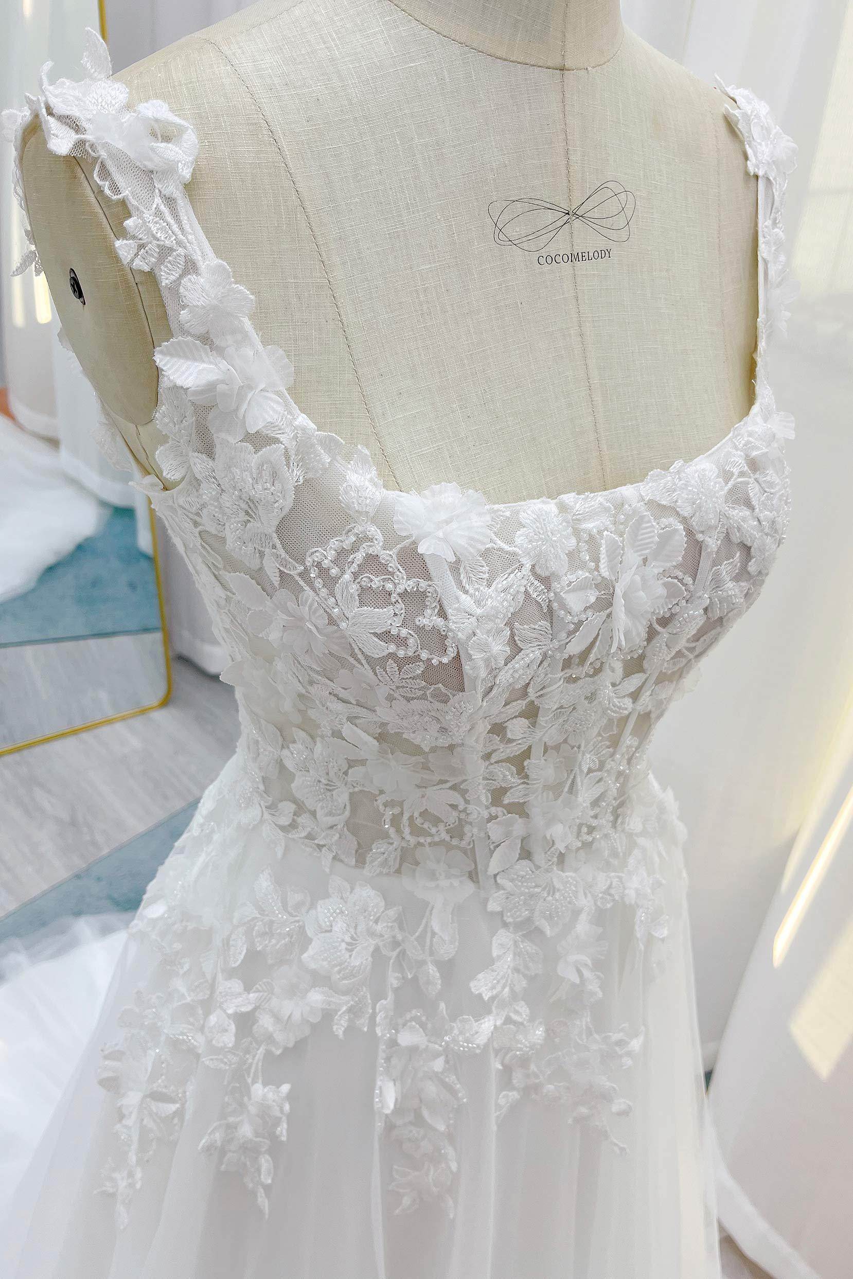 Exuding sophistication, this bridal gown features a square neckline adorned with intricate 3D floral appliques and delicate beading, evoking timeless beauty. Structured boning accentuates the silhouette gracefully, while the A-line Tulle skirt adds an ethereal, romantic touch to the ensemble.
