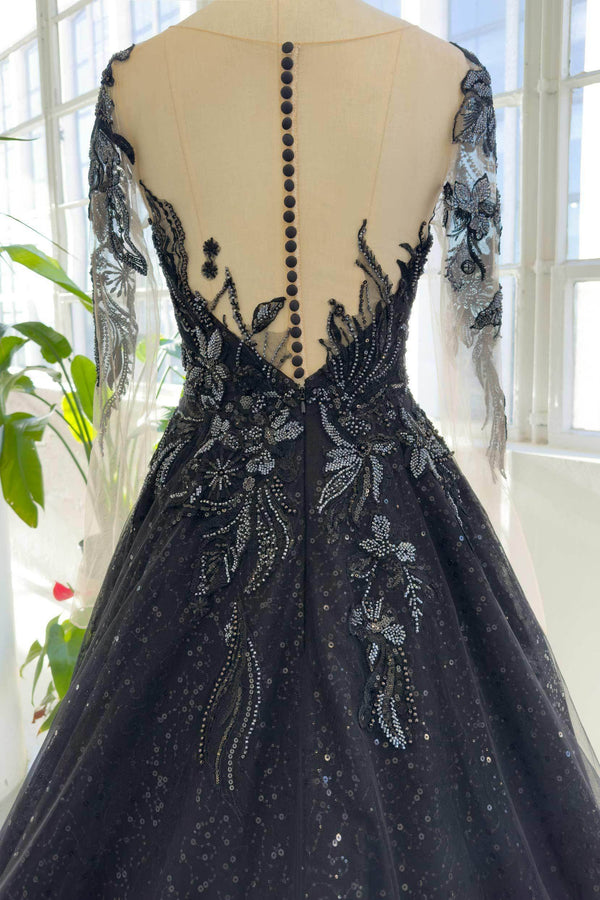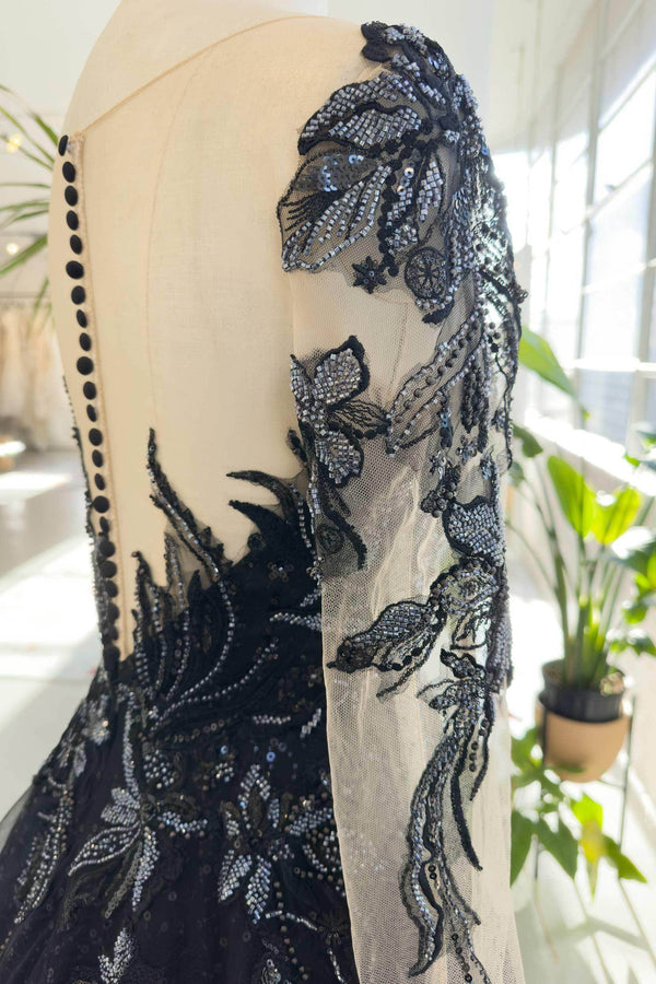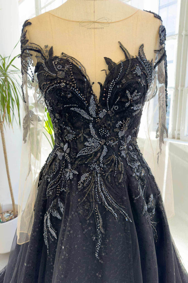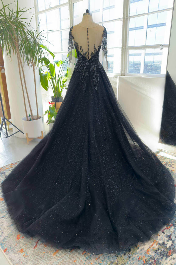 Embrace modern elegance with this Gothic-inspired wedding gown. Featuring a V-neck illusion neckline and long sleeves, Adorned with intricate Appliques and Beading,it exudes allure.The daring split adds drama, while hidden pockets offer convenience. Crafted with tulle in an A-line silhouette, it epitomizes sophistication.