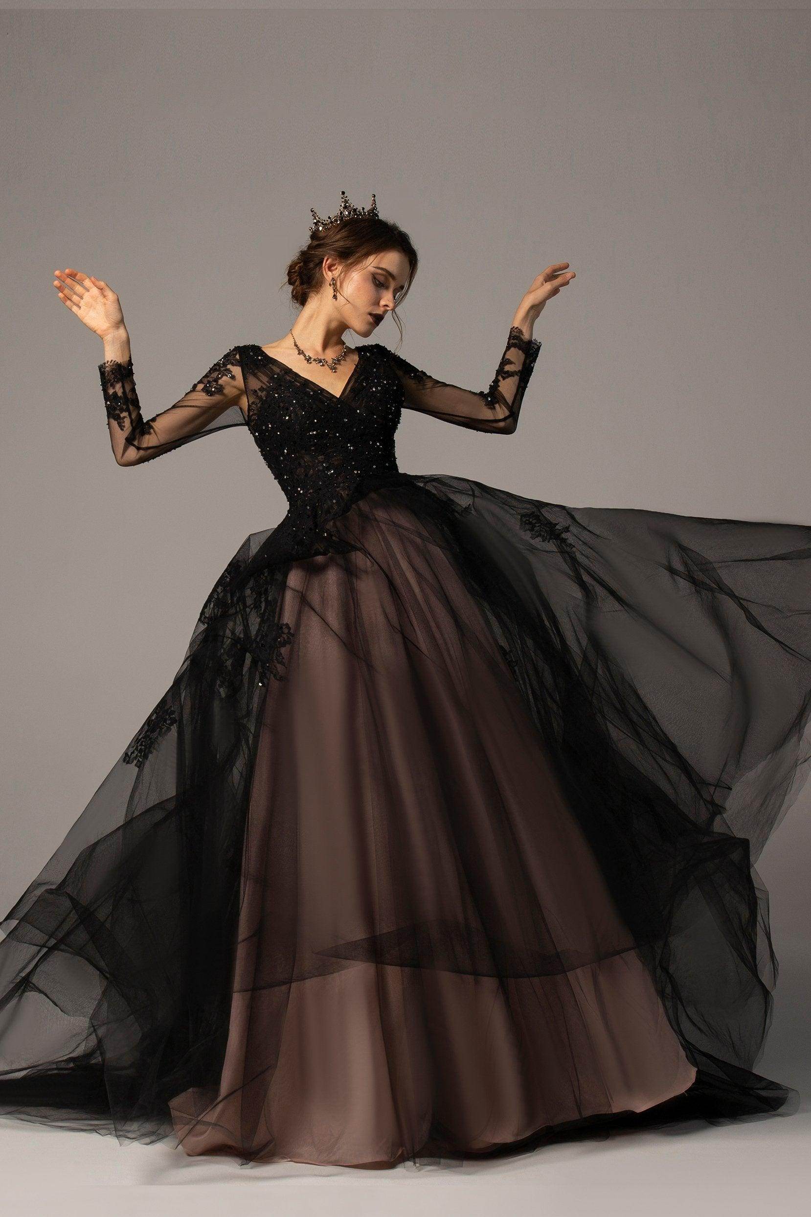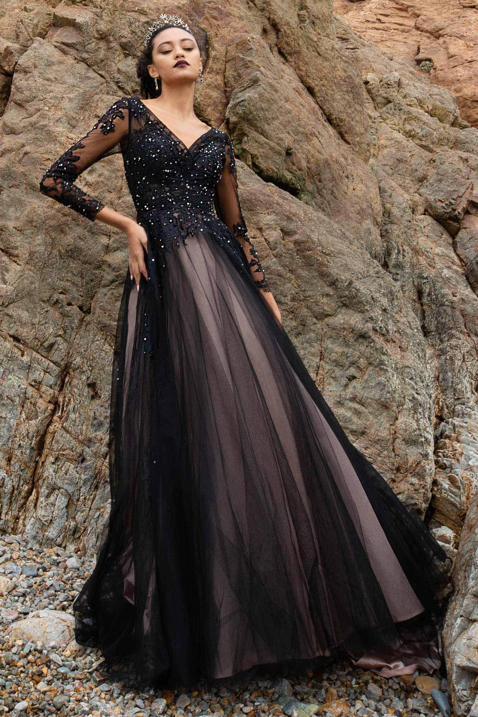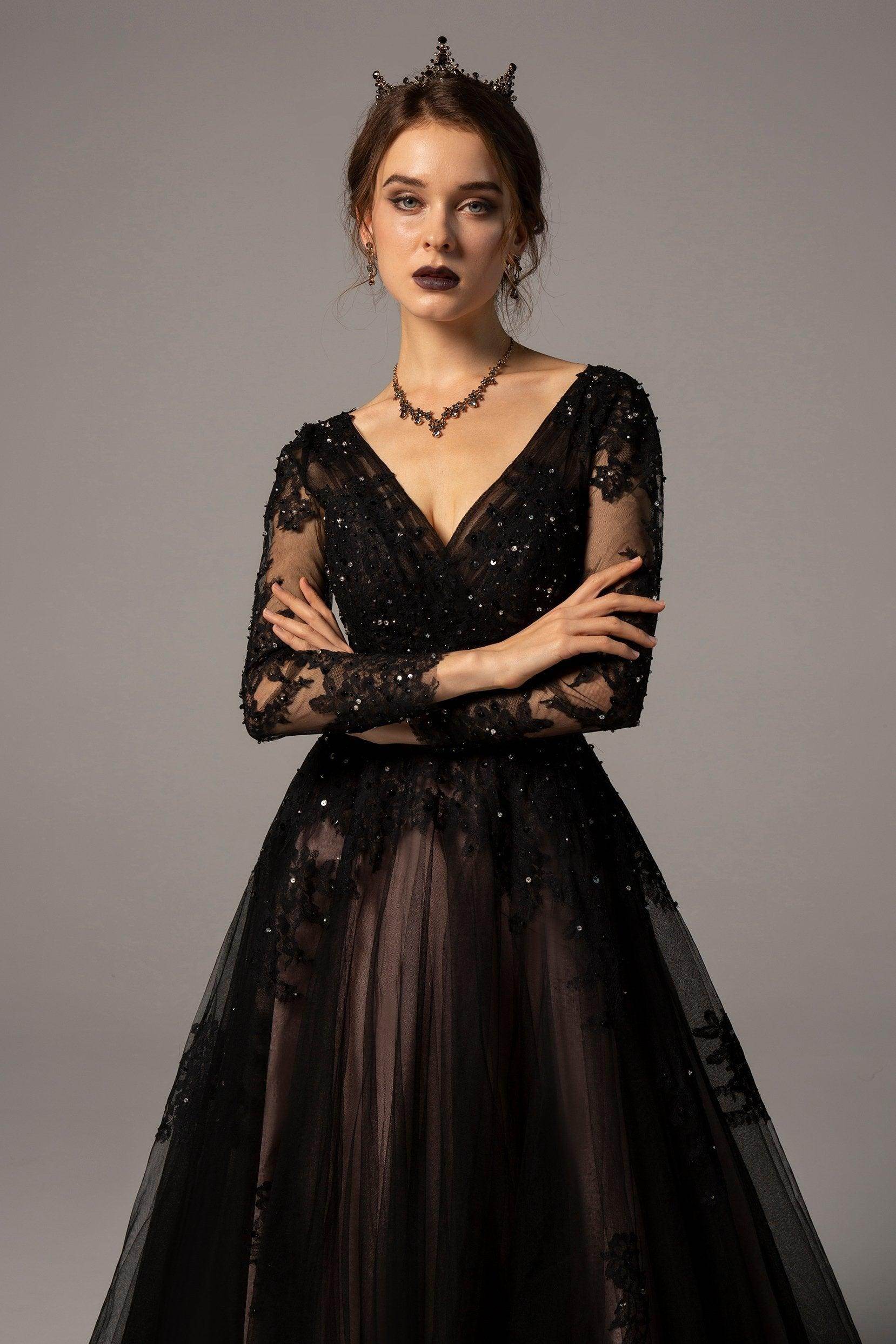 This chic black wedding gown features a Gothic allure with its illusion V-neckline and long sleeves. French-style appliques and sparkling beading adorn the A-line tulle silhouette, creating a dark romanticism. Finished with a striking court train, it adds a touch of drama.