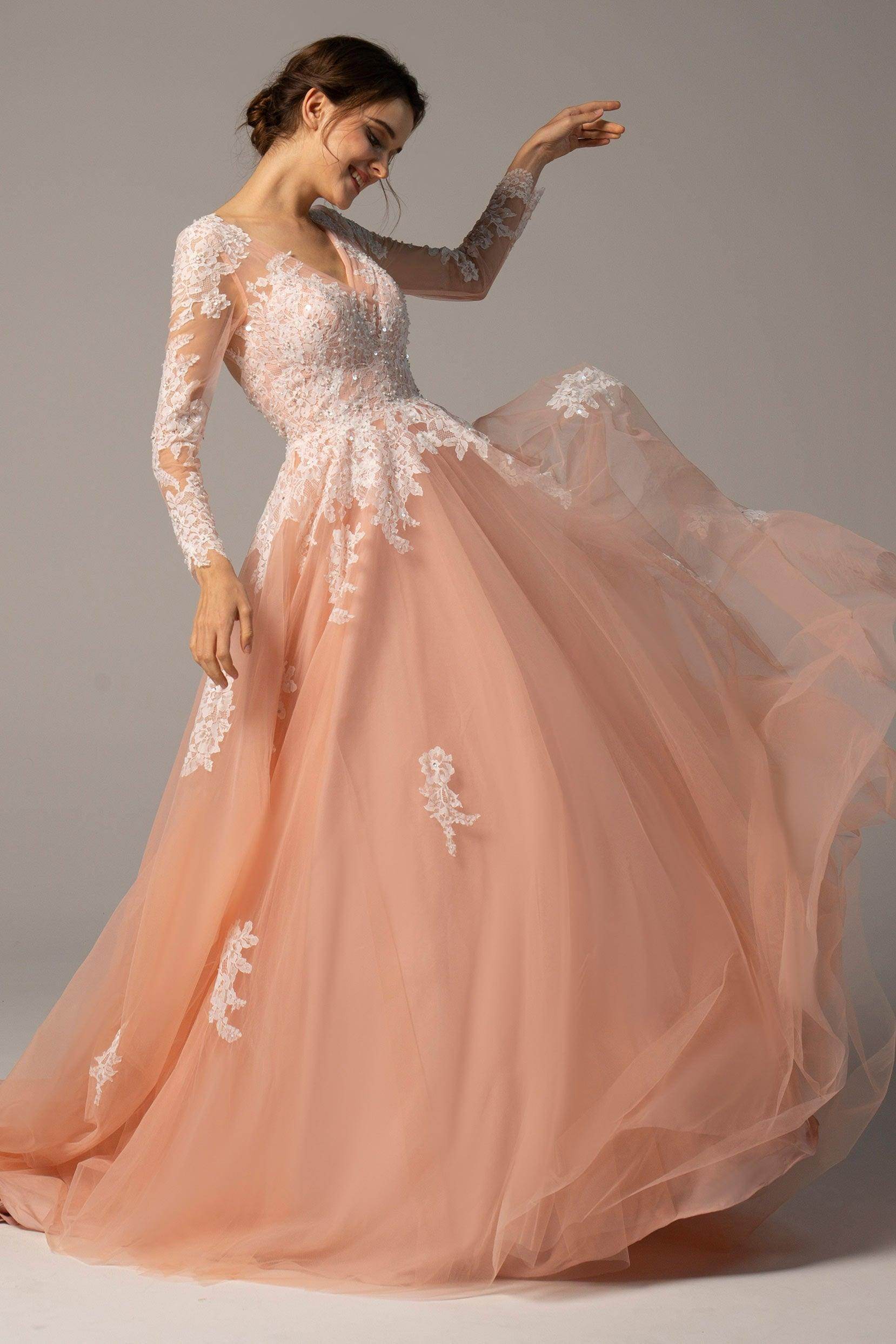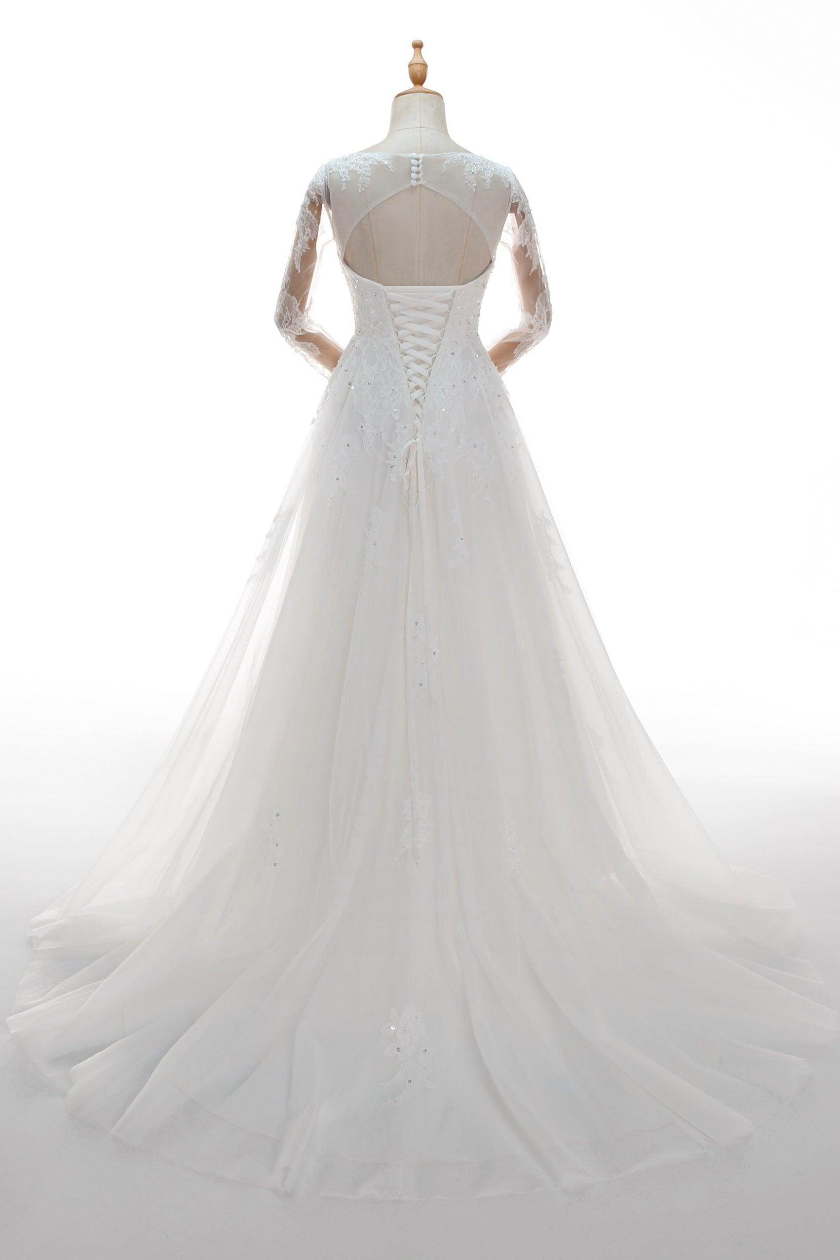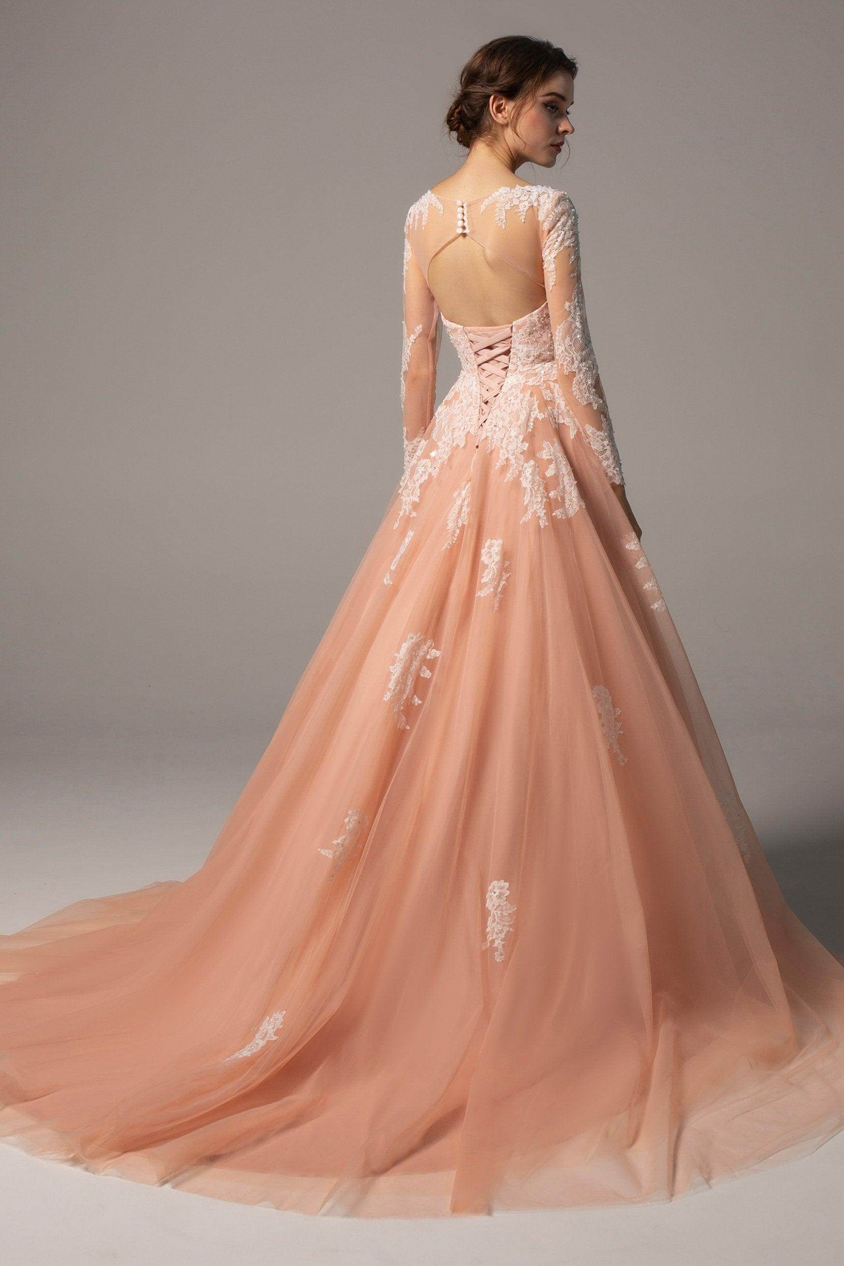 This chic black wedding gown features a Gothic allure with its illusion V-neckline and long sleeves. French-style appliques and sparkling beading adorn the A-line tulle silhouette, creating a dark romanticism. Finished with a striking court train, it adds a touch of drama.