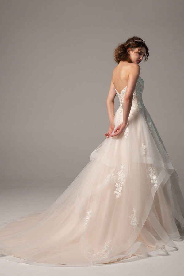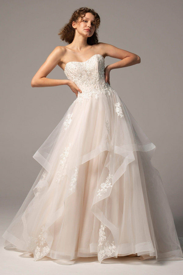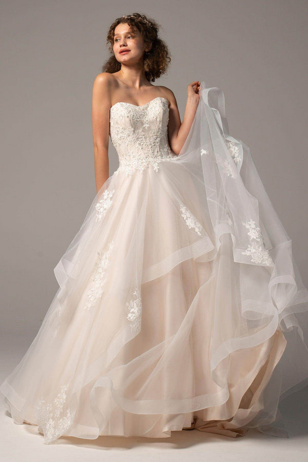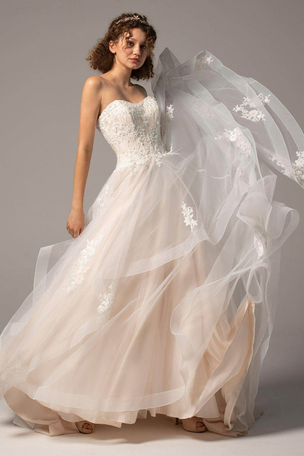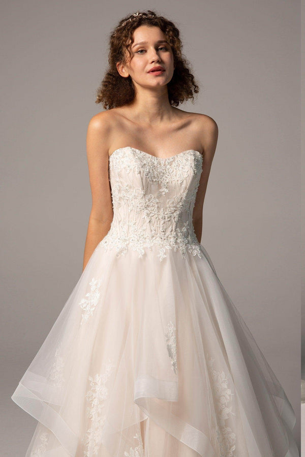 Meet BEXLEY, an enchanting A-line gown that radiates elegance for hotel, church, garden, or hall weddings. Featuring a sweetheart neckline, delicate appliques, and beading, this dress flatters every silhouette. The zipper with buttons and flowing court train create a flawless, timeless look.