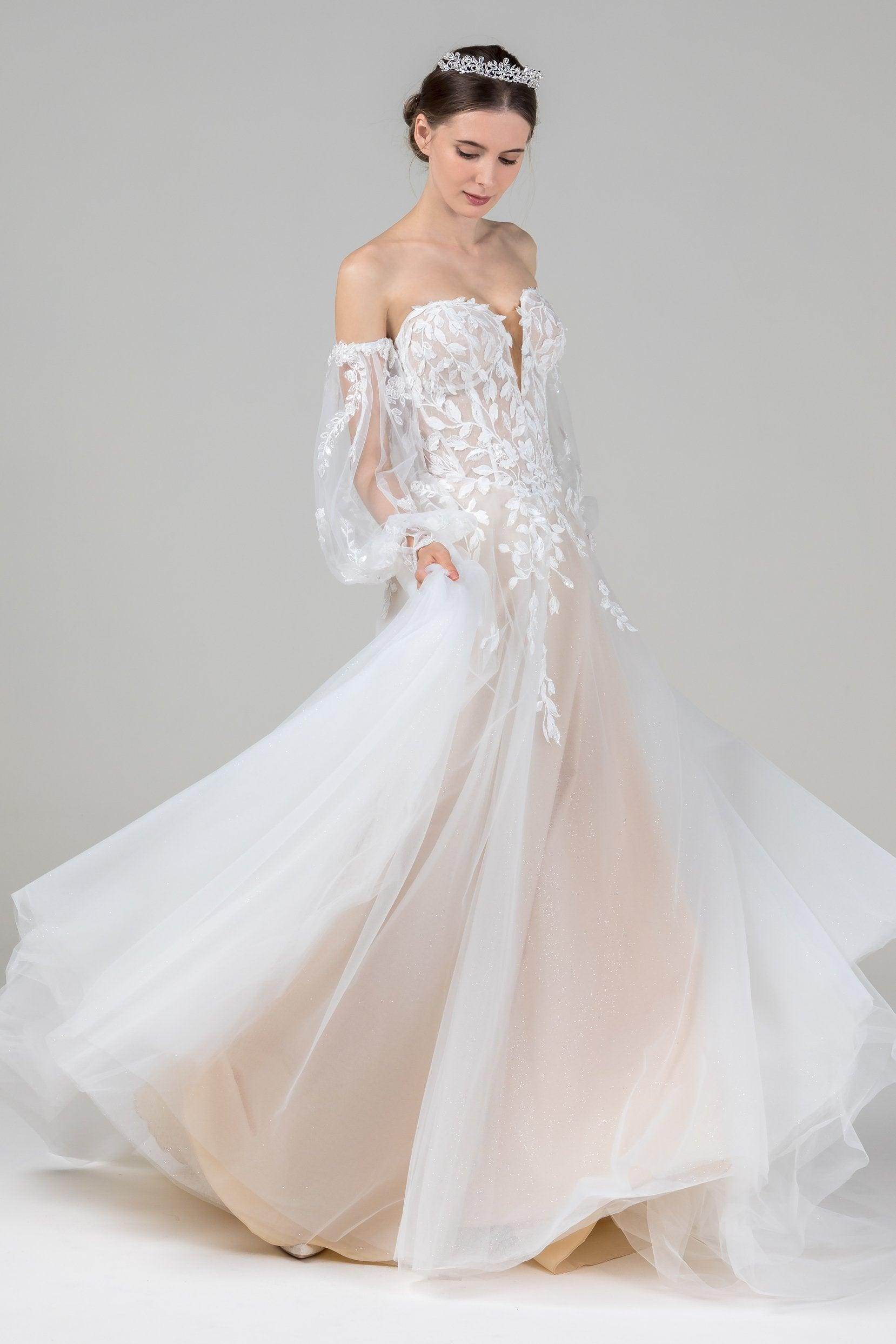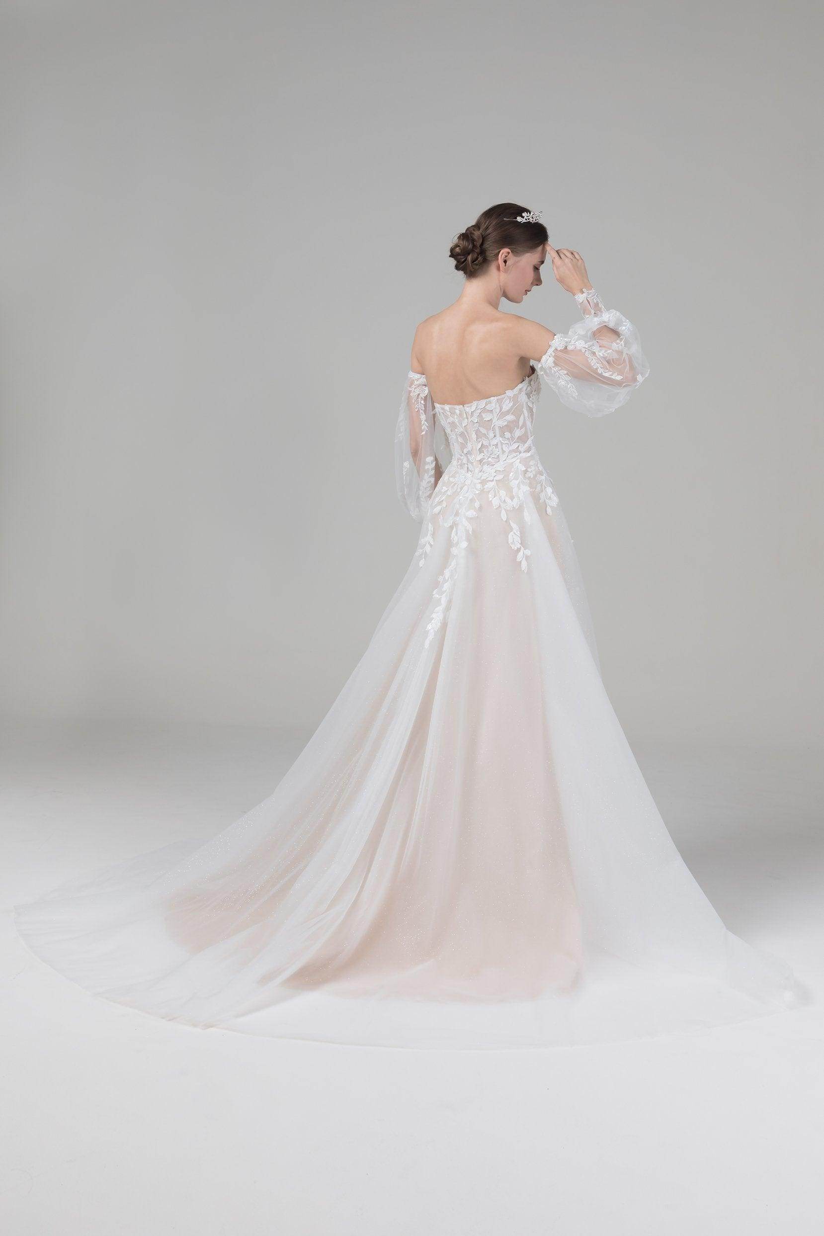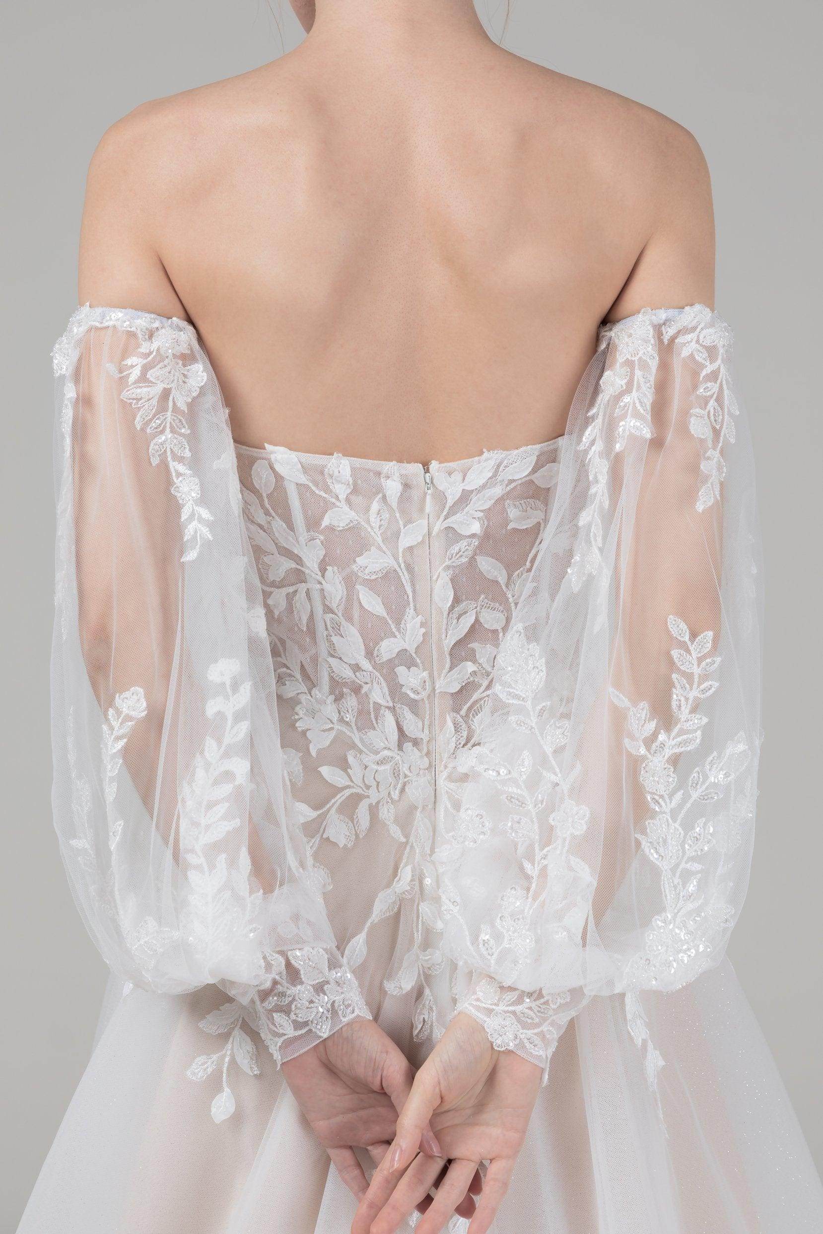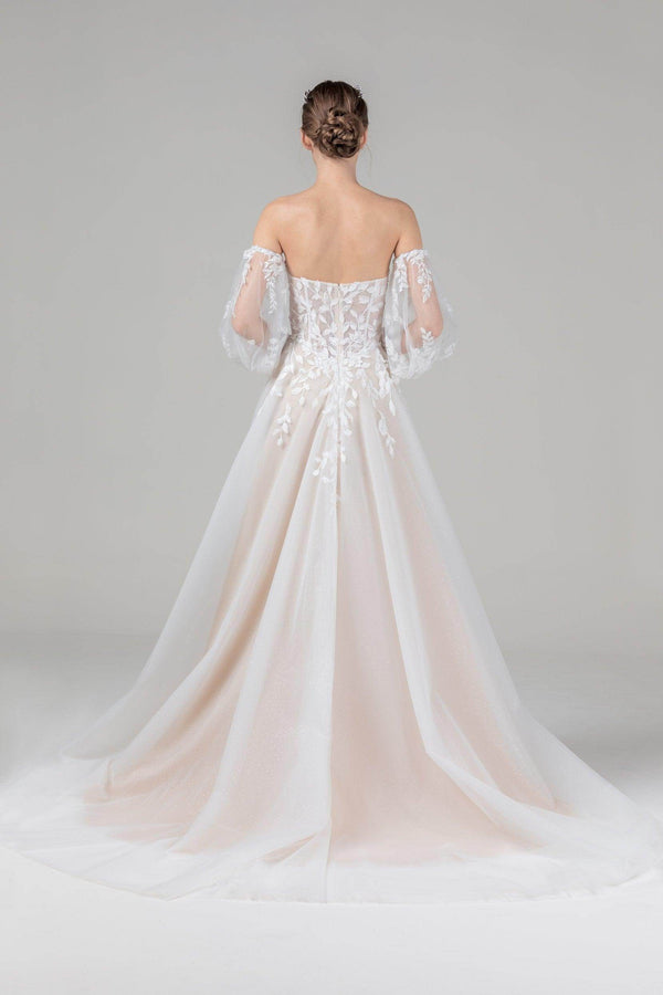 Introducing the MADISYN gown, an A-line beauty with intricate appliques and beading. Perfect for hotel, church, garden, and hall weddings, with a sweetheart neckline and detachable off-shoulder sleeves for a second look!