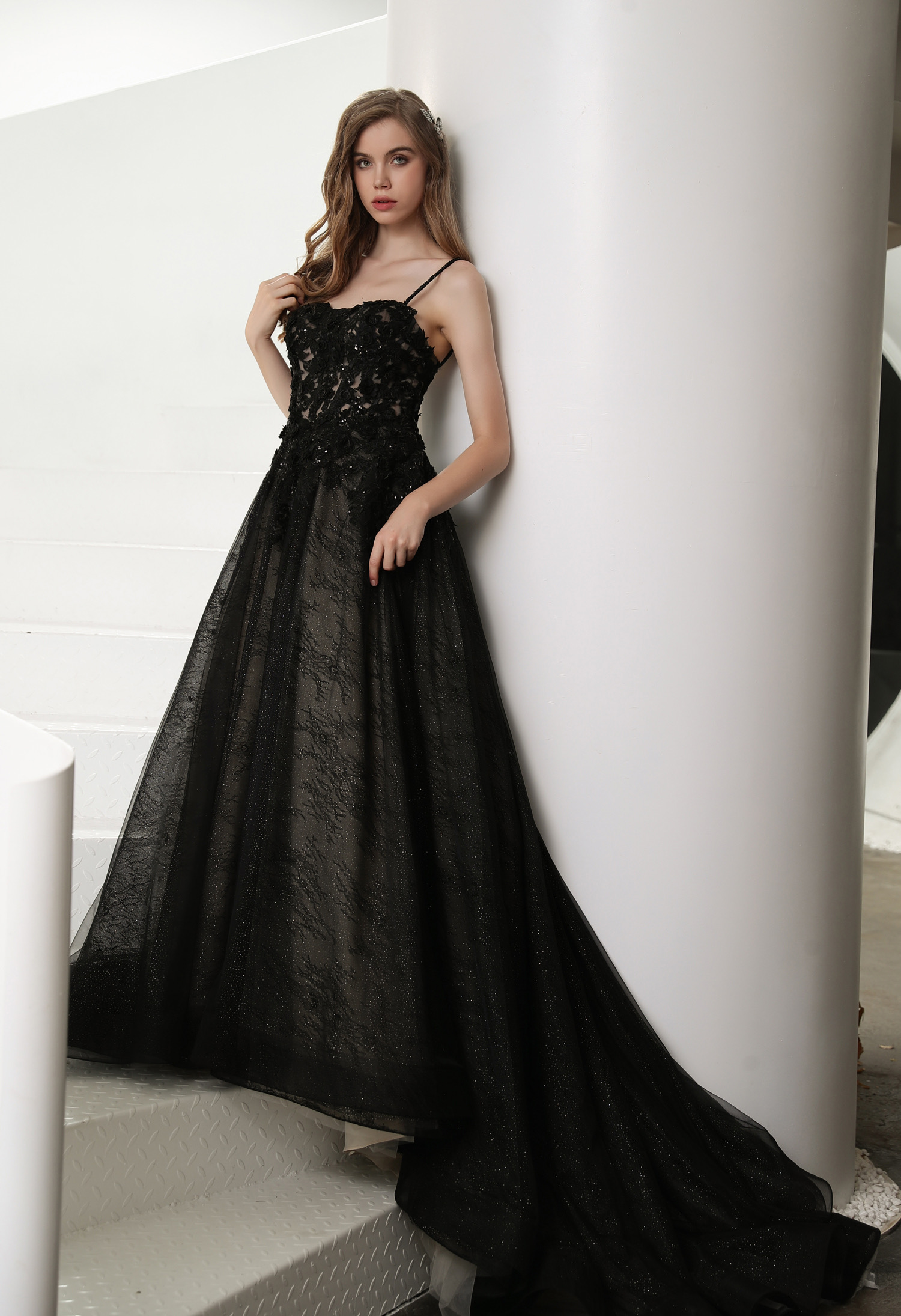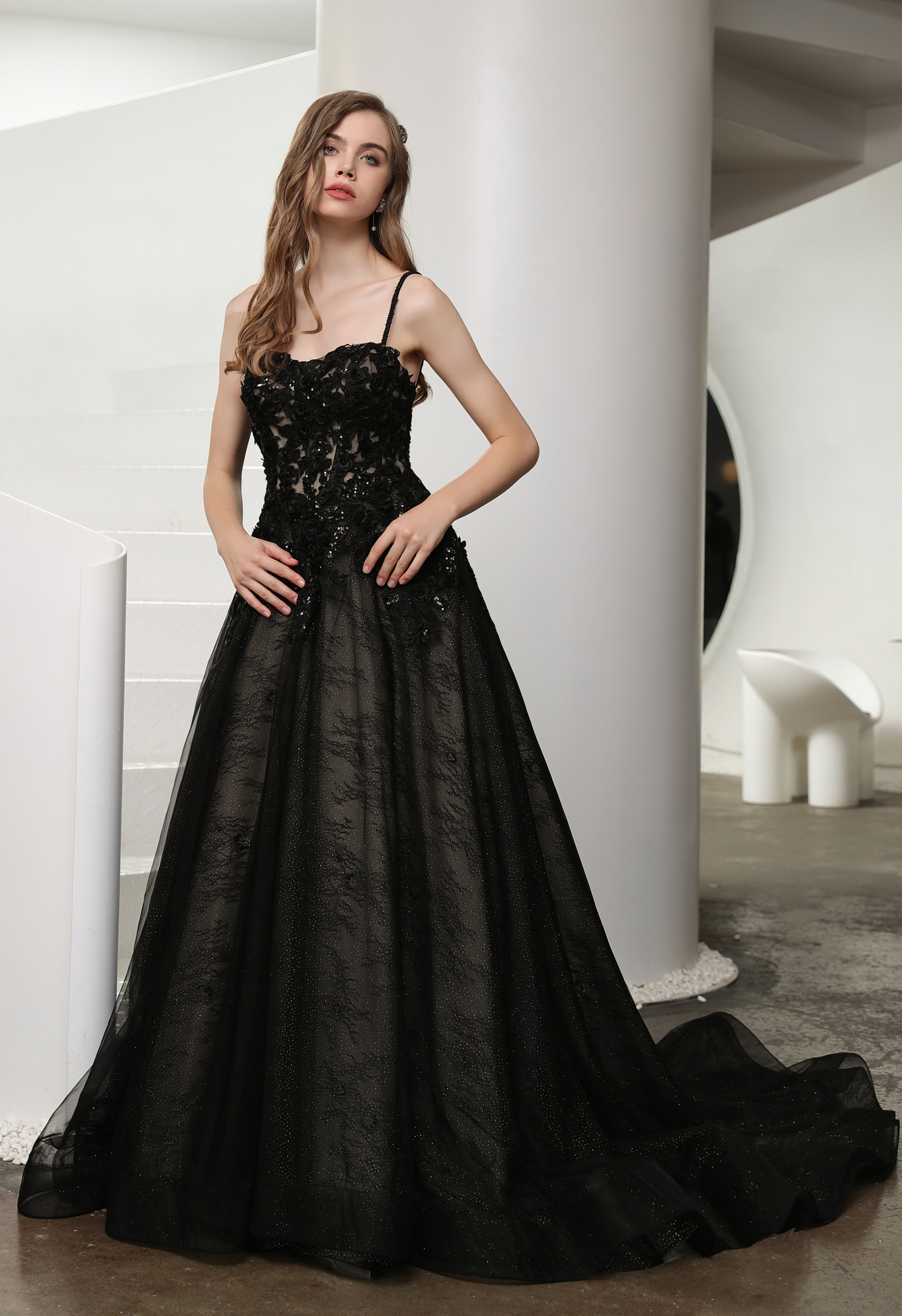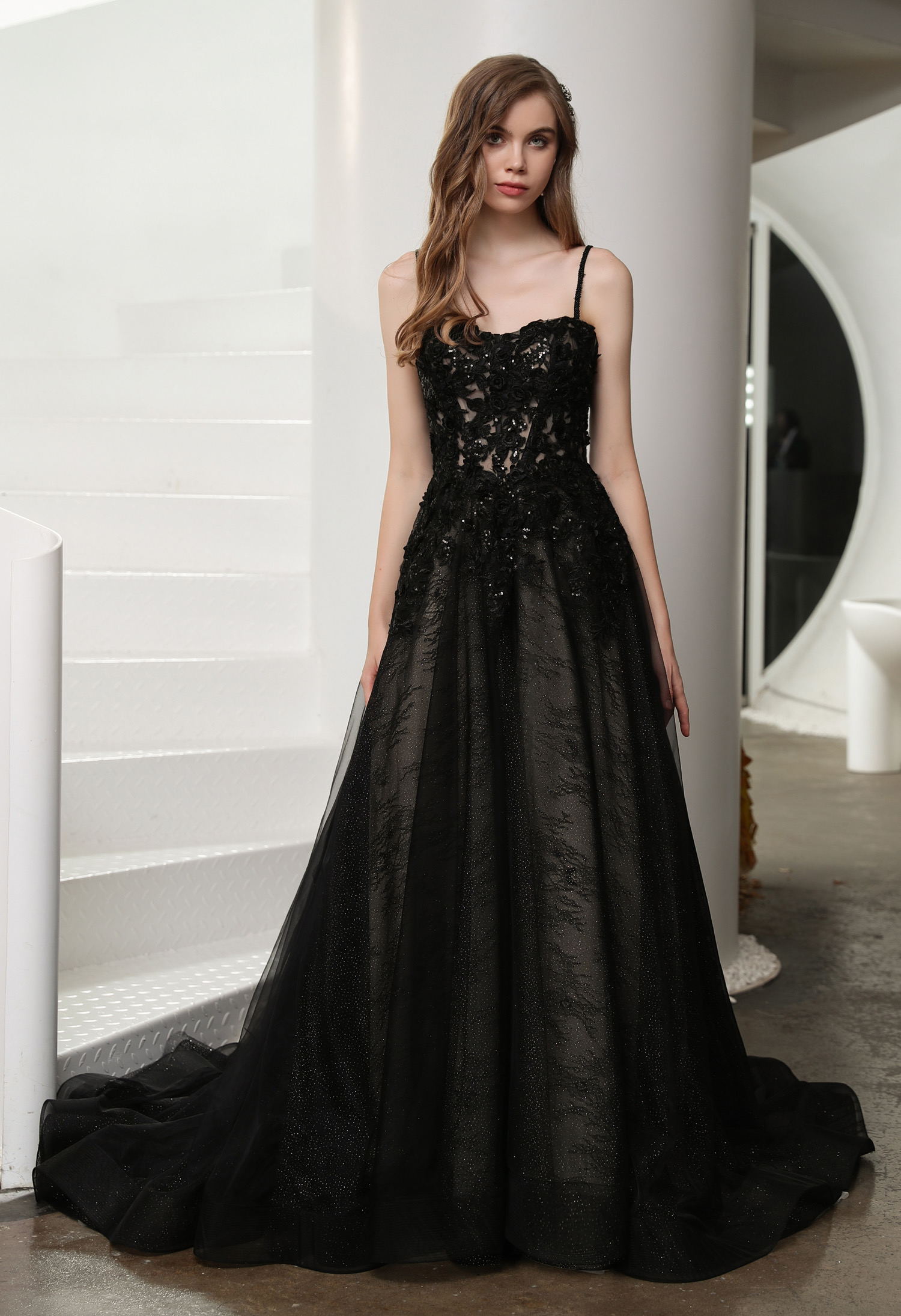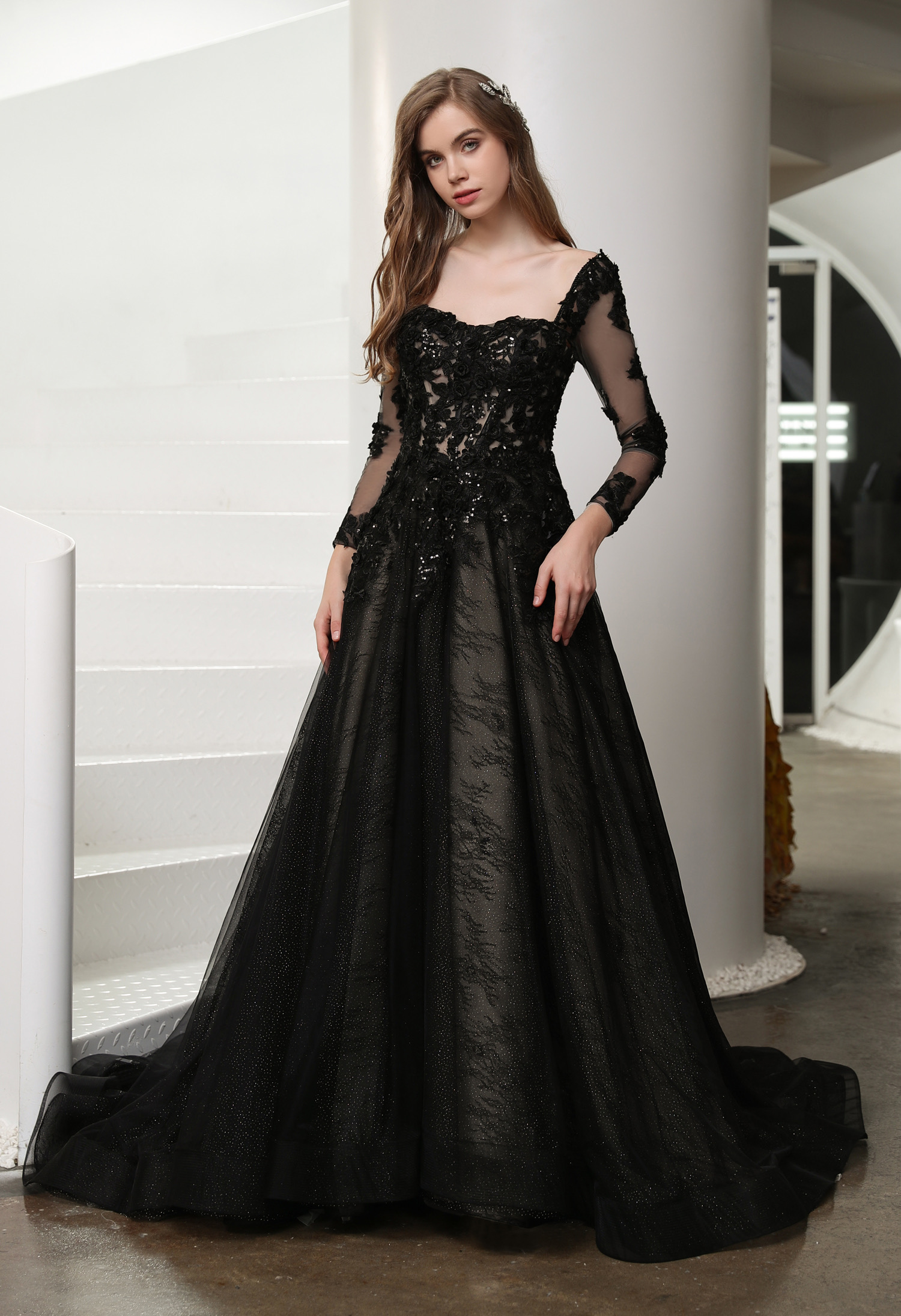 This black wedding dress is dark and dreamy vision in romantic lace and sparkle tulle.The illusion bodice features sweetheart neckline adorned in gorgeous beaded lace appliques and along beaded straps to the low back. The detachable illusion long sleeves add a touch of true romance and the skirt features a sparkle tulle underlay that makes a shimmery statemen.Hemline trimmed in horsehair, completing the tulle skirt.
