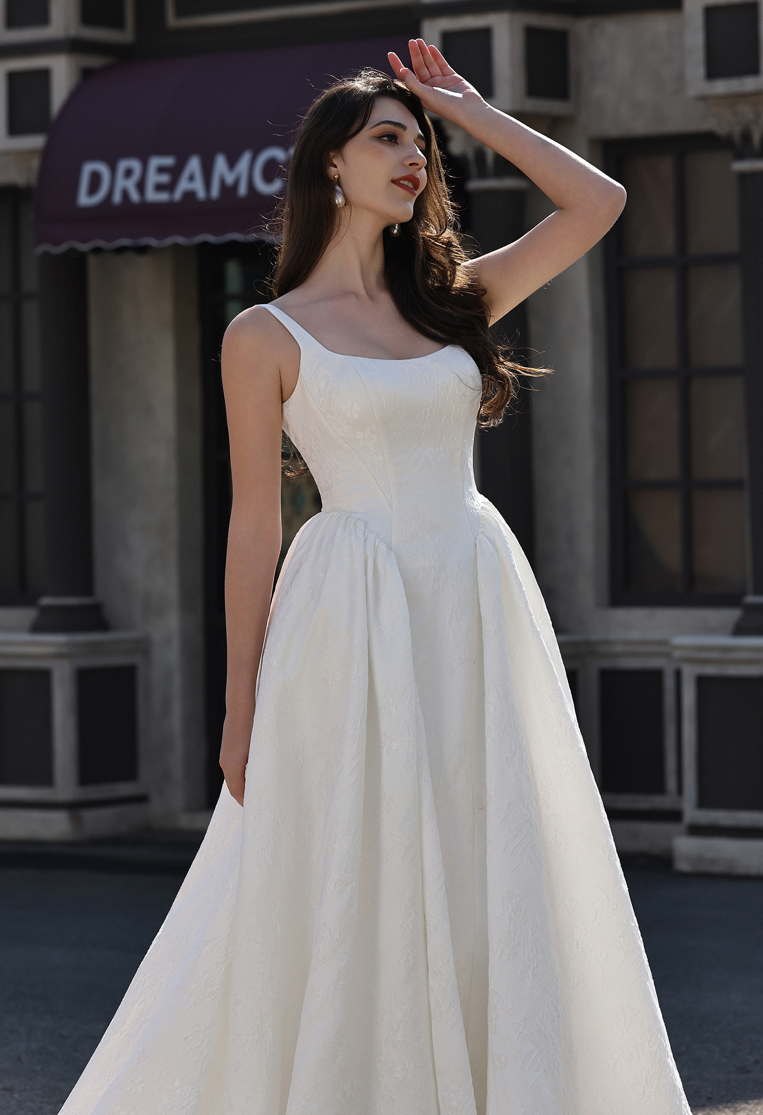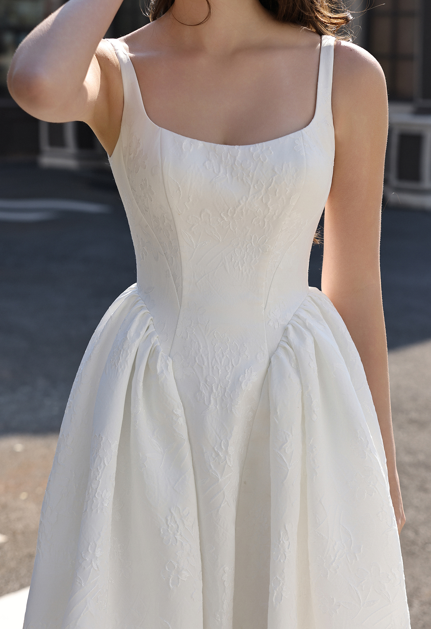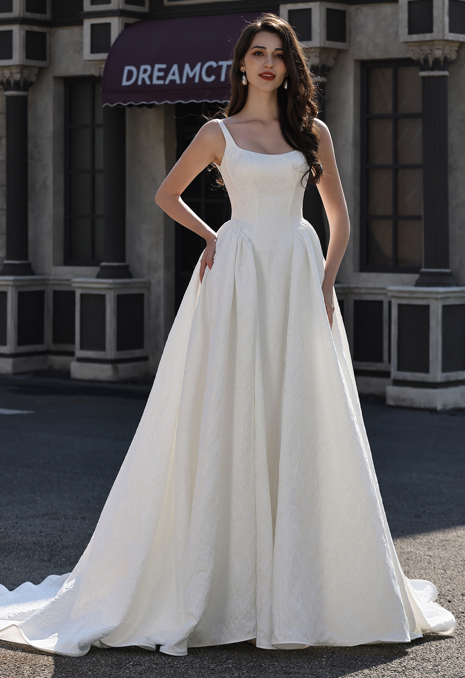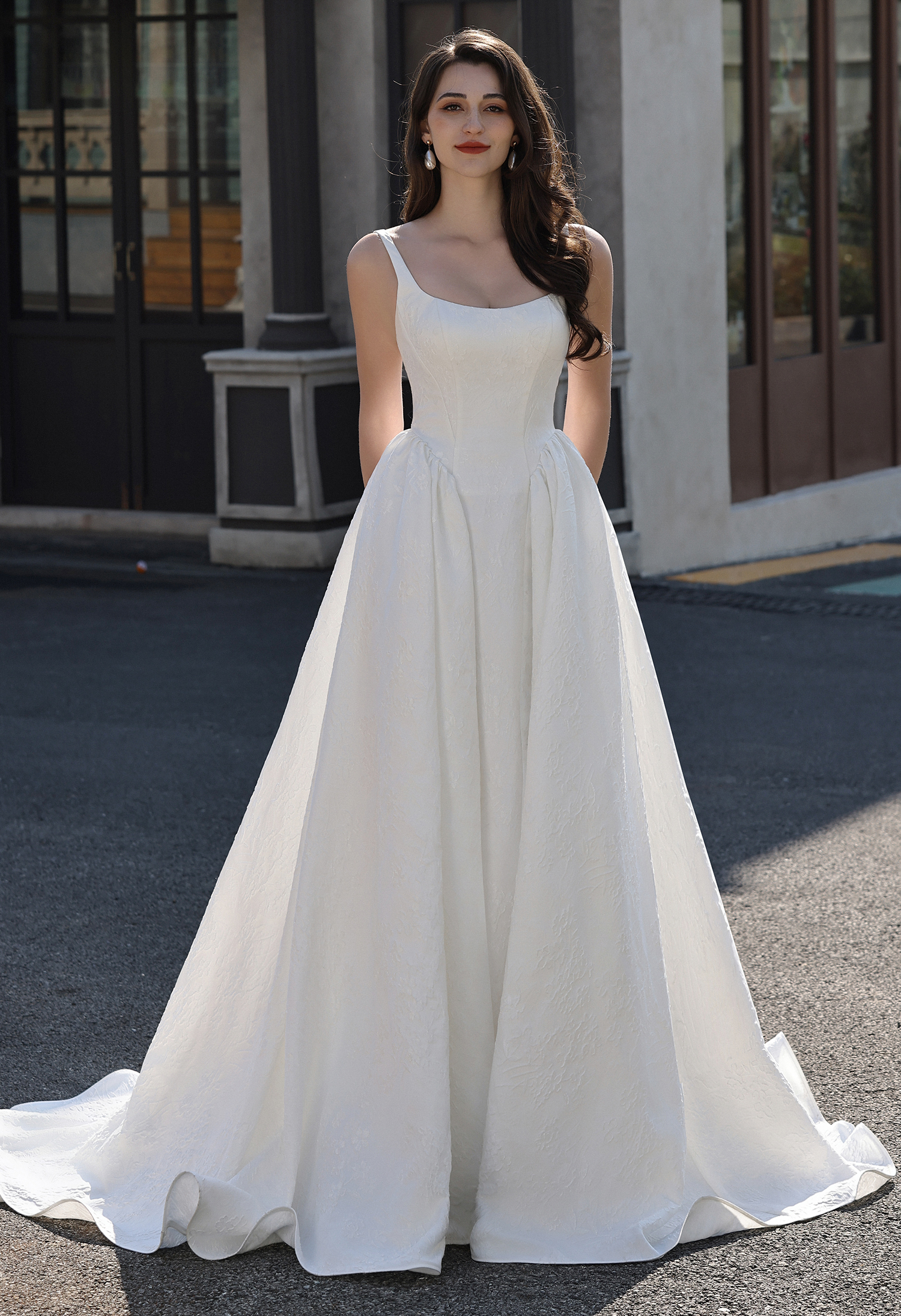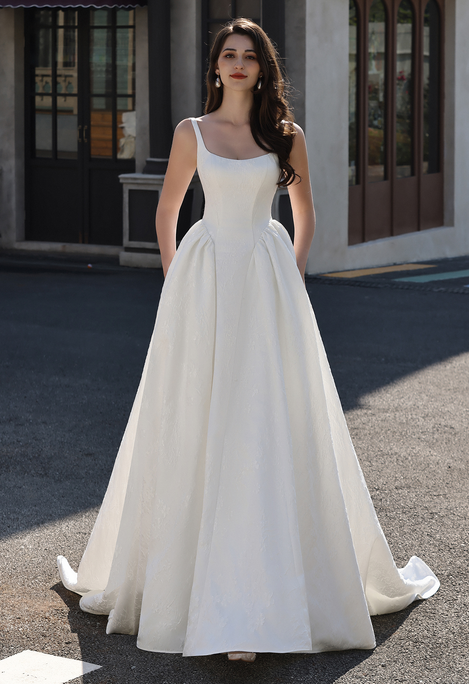 This timeless gown blends understated luxury with structured romance: crafted from ivory jacquard satin (featuring delicate tonal floral texture), its sleek square-neck camisole bodice cinches the waist, while the dramatic gathered basque ballgown skirt blooms into a voluminous, flowing silhouette. The minimalist straps highlight graceful shoulders, and the subtle embossed pattern adds quiet depth.