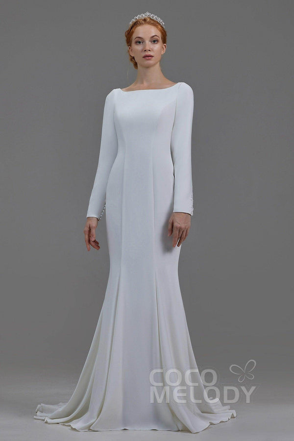Introducing the GRETA wedding dress—an embodiment of minimalist elegance. Crafted from soft ivory knitted fabric, this trumpet silhouette features a bateau neckline and long sleeves with appliqués and beading. Ideal for beach, church, hotel, or hall weddings, its court train adds vintage charm. Embrace your beauty!