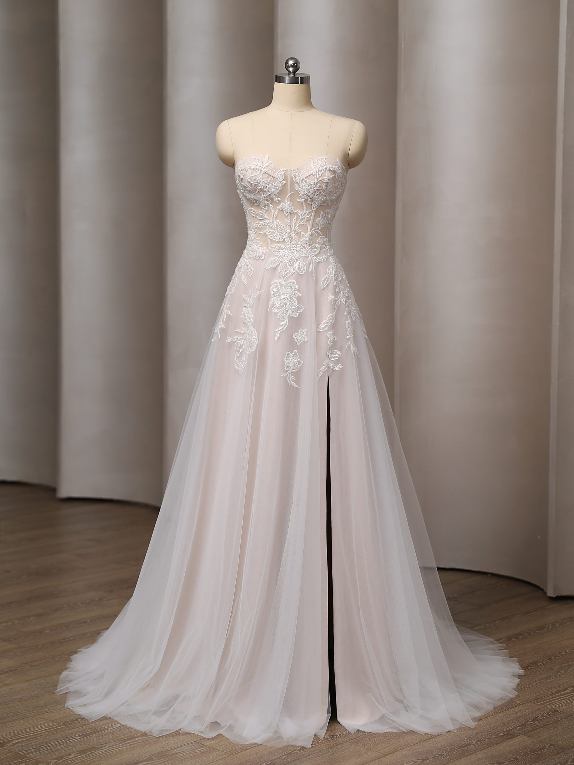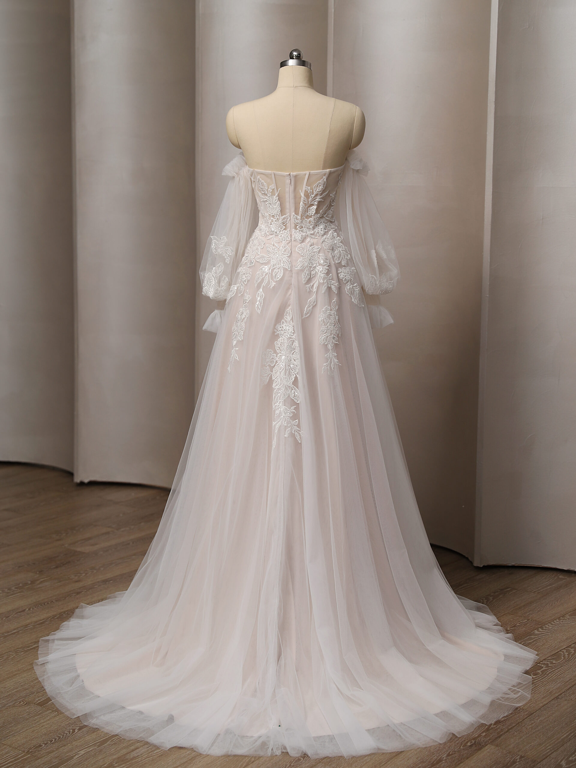 This wedding dress is full of romance and elegance.  The detachable sleeves design generously reveals the charming shoulder and neck lines.  The exquisite lace embroidery on the upper body is like a blooming flower, delicate and three-dimensional, and naturally connects with the soft and elegant light pink tulle skirt below.  The skirt is slender and drags on the ground, and the slit design on one side adds a touch of agility and sexiness.  The overall shape is both dreamy and noble, and it is a dazzling choice for the wedding.