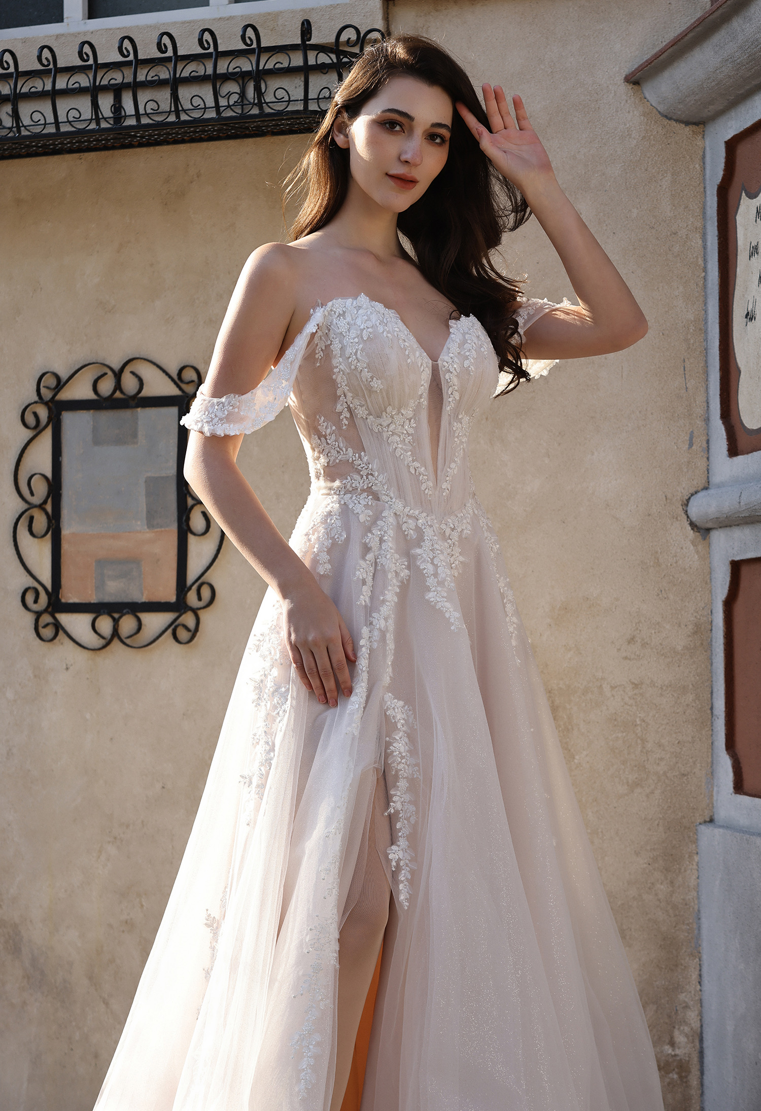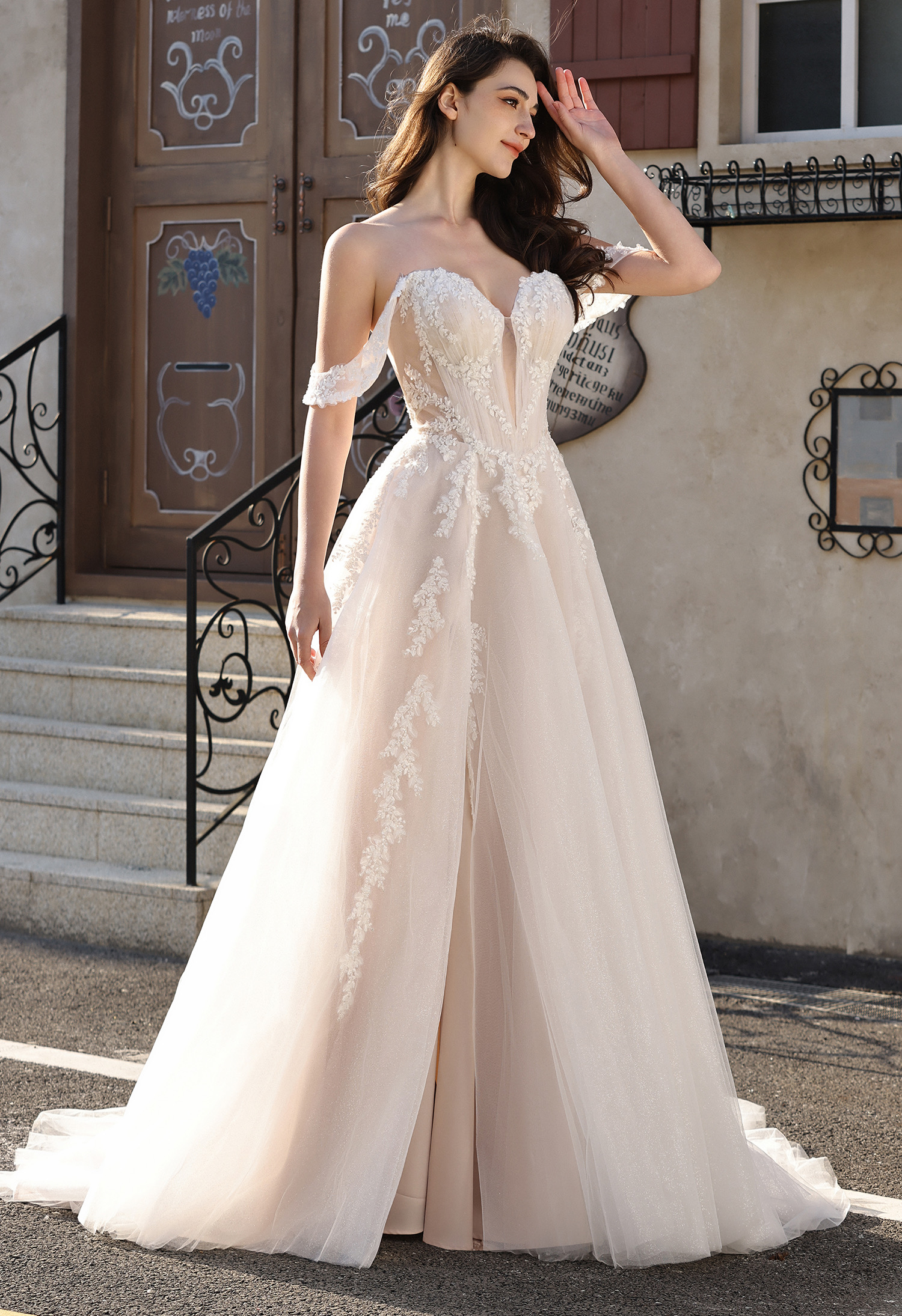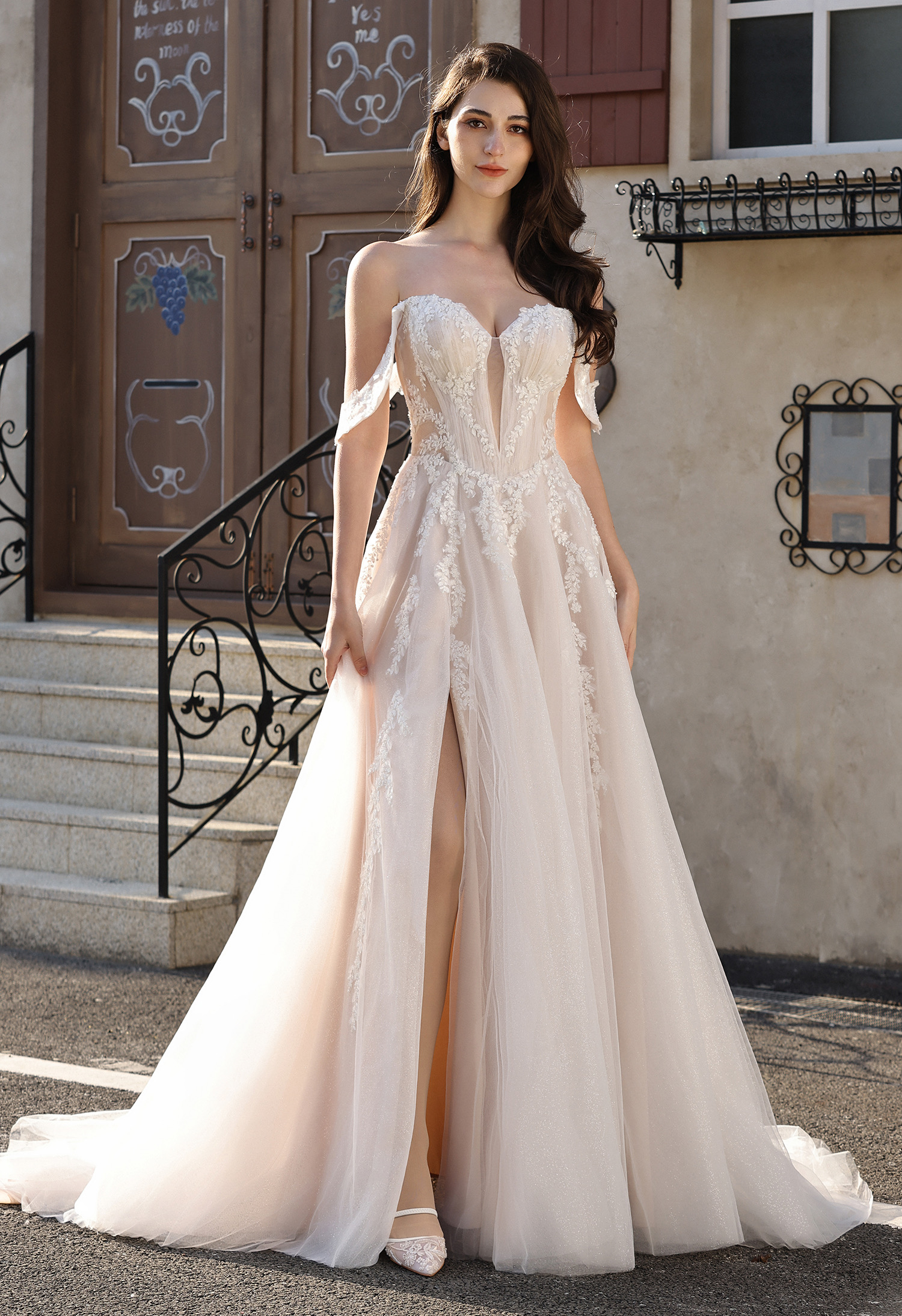 This romantic bridal gown blends soft elegance with modern allure: featuring an off-the-shoulder sweetheart neckline (framed by delicate sheer lace cap sleeves) and a figure-flattering corset bodice. The bodice is adorned with intricate leaf lace appliqués that trail down the sheer tulle overlay, while a subtle plunging sheer panel adds a touch of sophistication.The flowing A-line skirt (crafted from shimmering blush glitter tulle) includes a high thigh slit for effortless movement, and drapes into a graceful train that catches light beautifully. Perfect for brides seeking a balance of feminine charm and contemporary edge—ideal for outdoor ceremonies, garden weddings, or formal receptions.