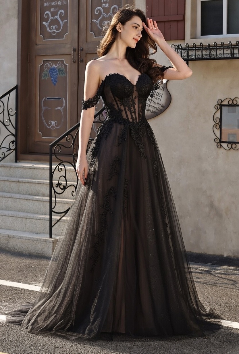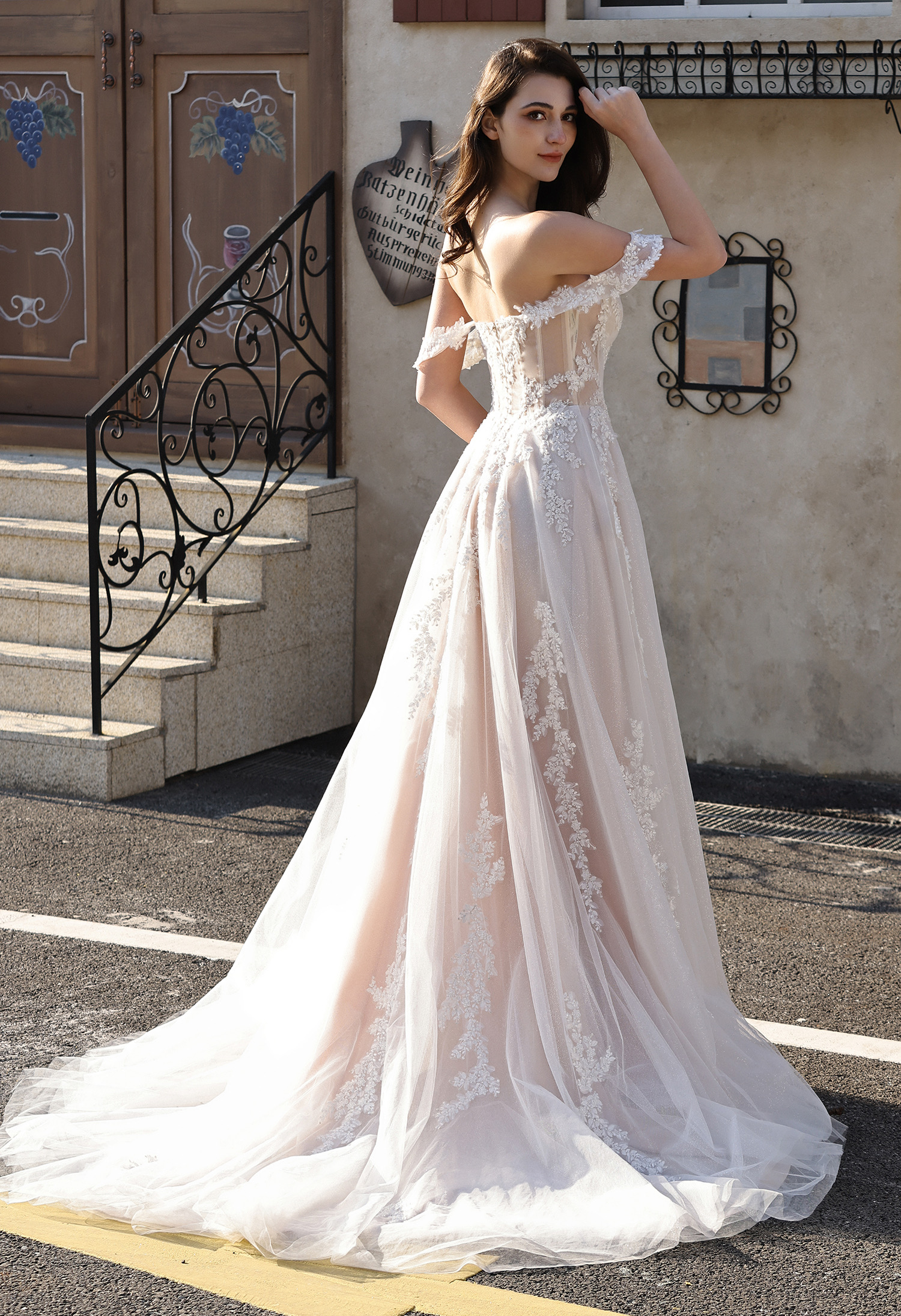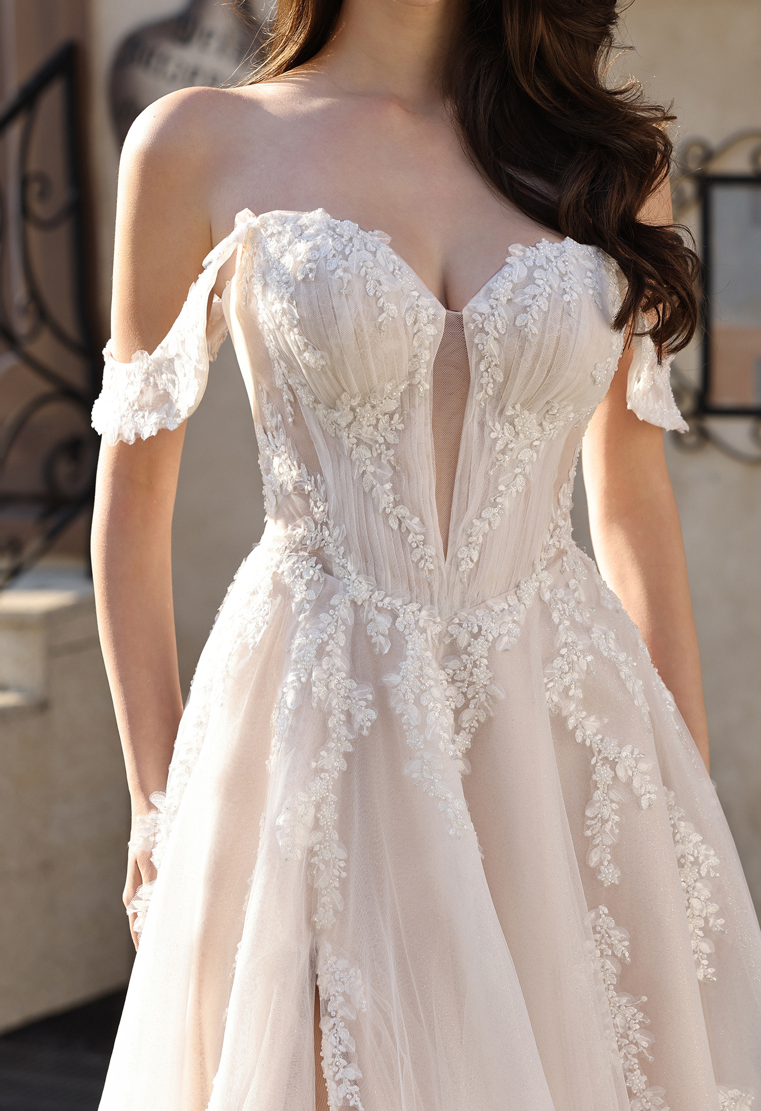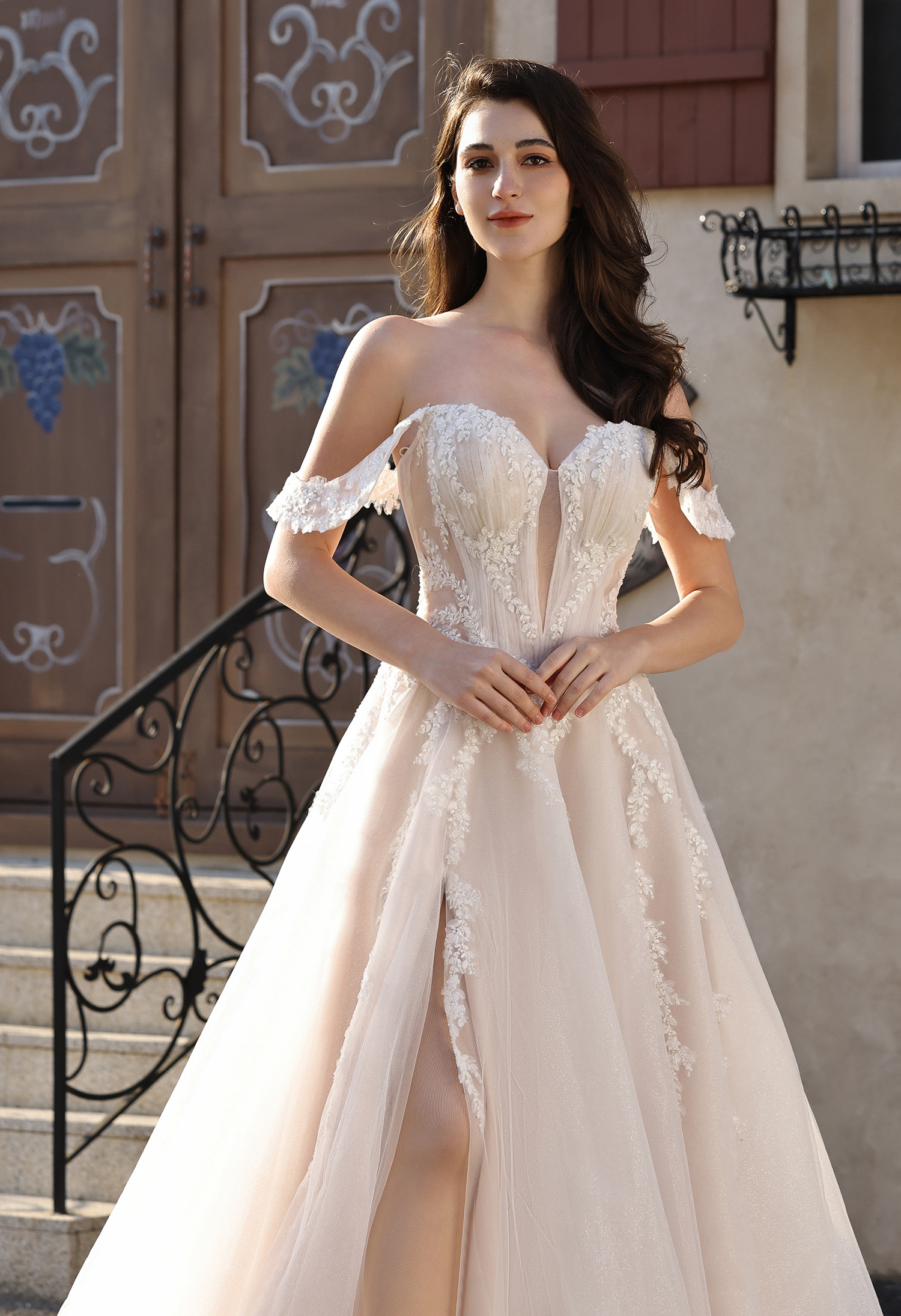 This romantic bridal gown blends soft elegance with modern allure: featuring an off-the-shoulder sweetheart neckline (framed by delicate sheer lace cap sleeves) and a figure-flattering corset bodice. The bodice is adorned with intricate leaf lace appliqués that trail down the sheer tulle overlay, while a subtle plunging sheer panel adds a touch of sophistication.The flowing A-line skirt (crafted from shimmering blush glitter tulle) includes a high thigh slit for effortless movement, and drapes into a graceful train that catches light beautifully. Perfect for brides seeking a balance of feminine charm and contemporary edge—ideal for outdoor ceremonies, garden weddings, or formal receptions.