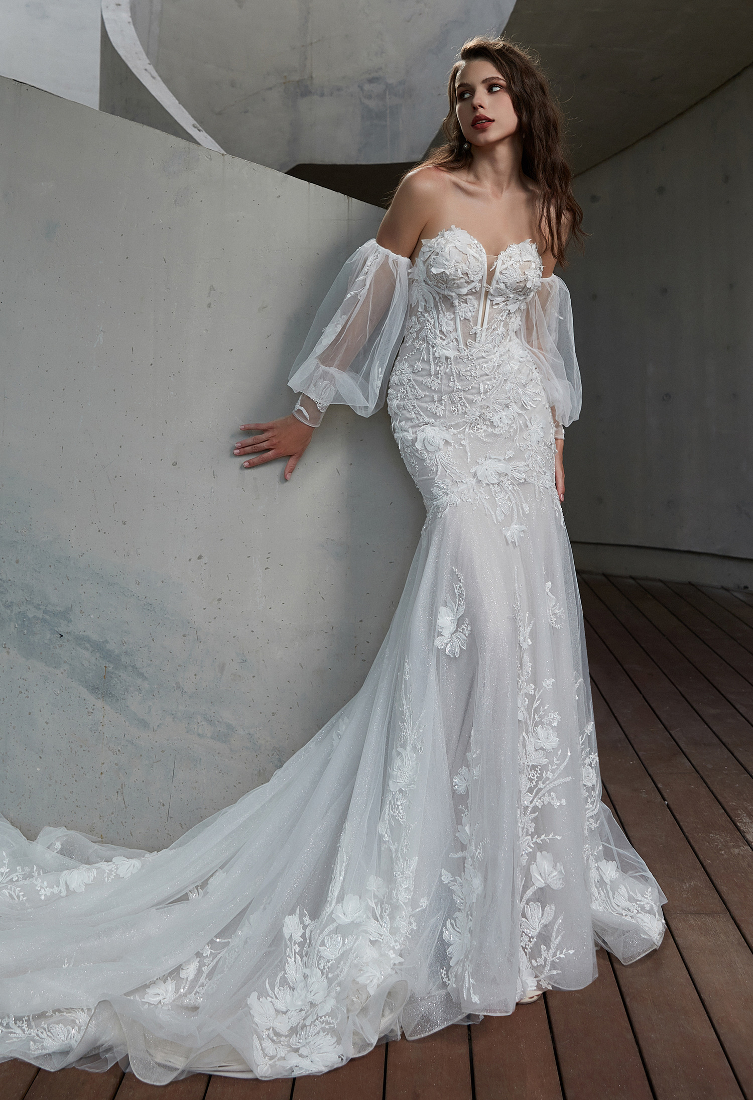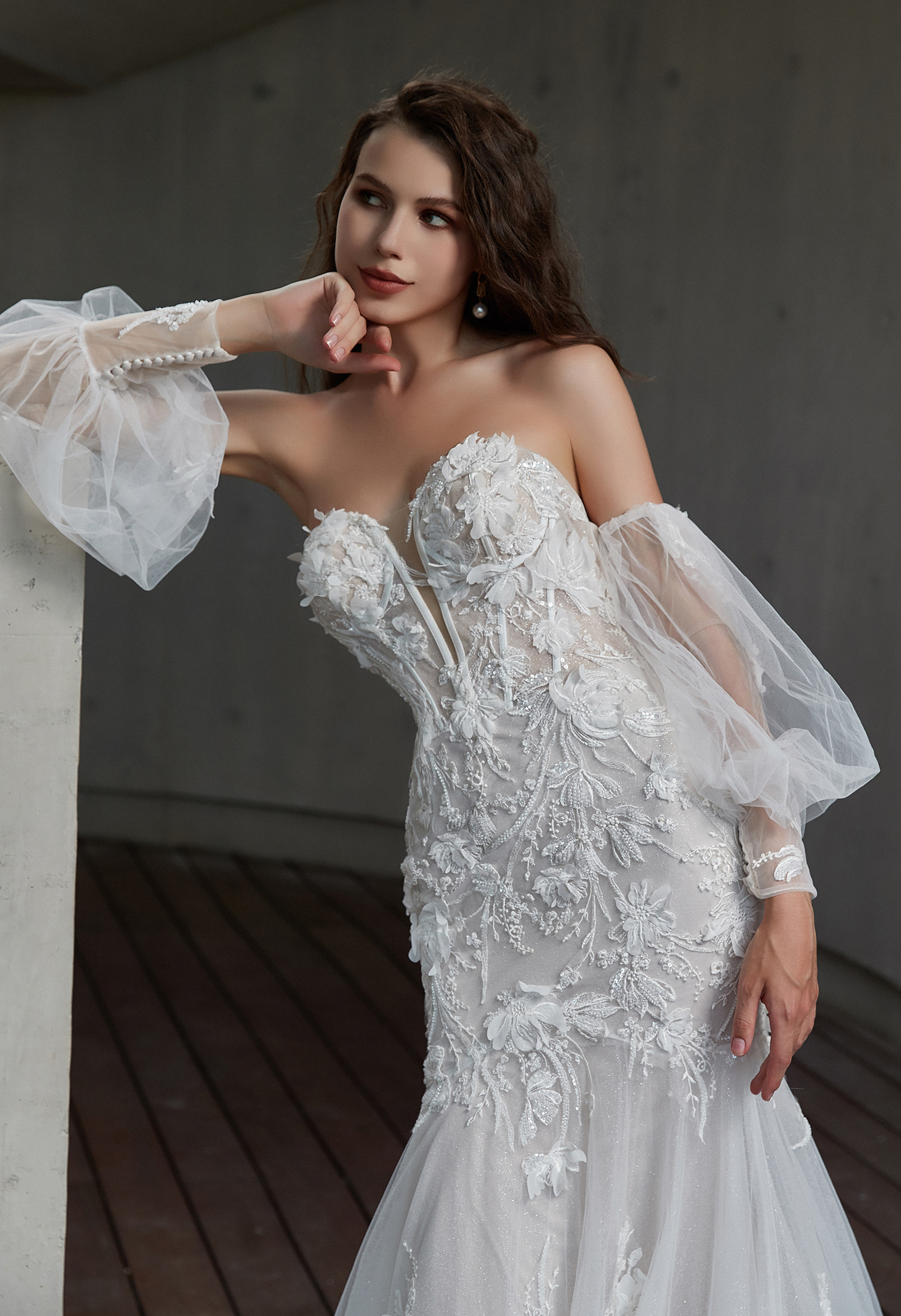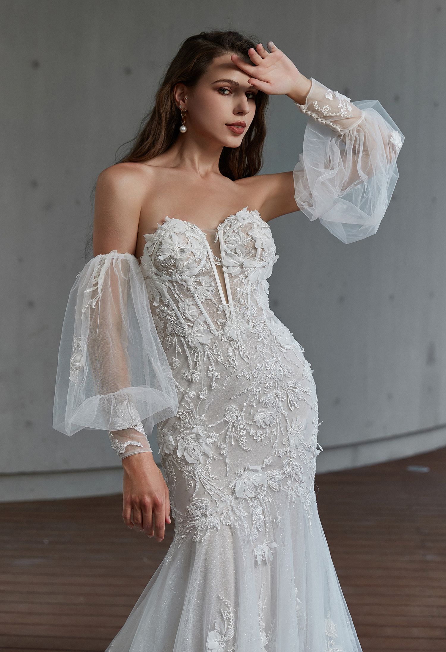 Embody romance and sexy in this show-stopping mermaid wedding dress. A strapless sweetheart bustier bodice exposes the sexy corset boning underneath sheer tulle and hand-placed floral lace traces the sweetheart plunge at the neckline. Detachable off-the-shoulder blouson sleeves feature delicate lace cuffs and fabric-covered buttons that trail from the wrist for a versatile and timeless accessory. The skirt flares out below the hips for a show-stopping flourish, with layers and layers of tulle creating a regal, voluminous skirt worthy of your grand entrance.