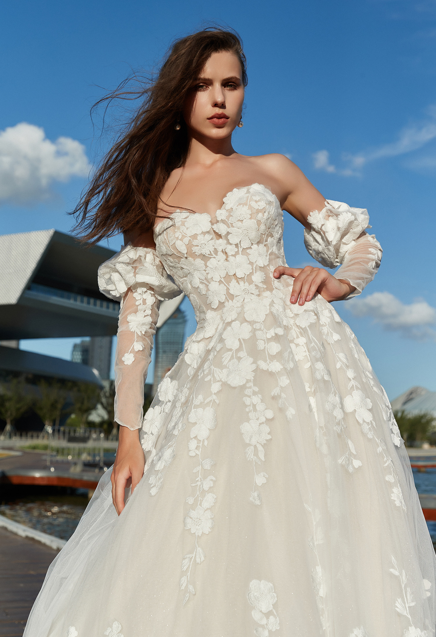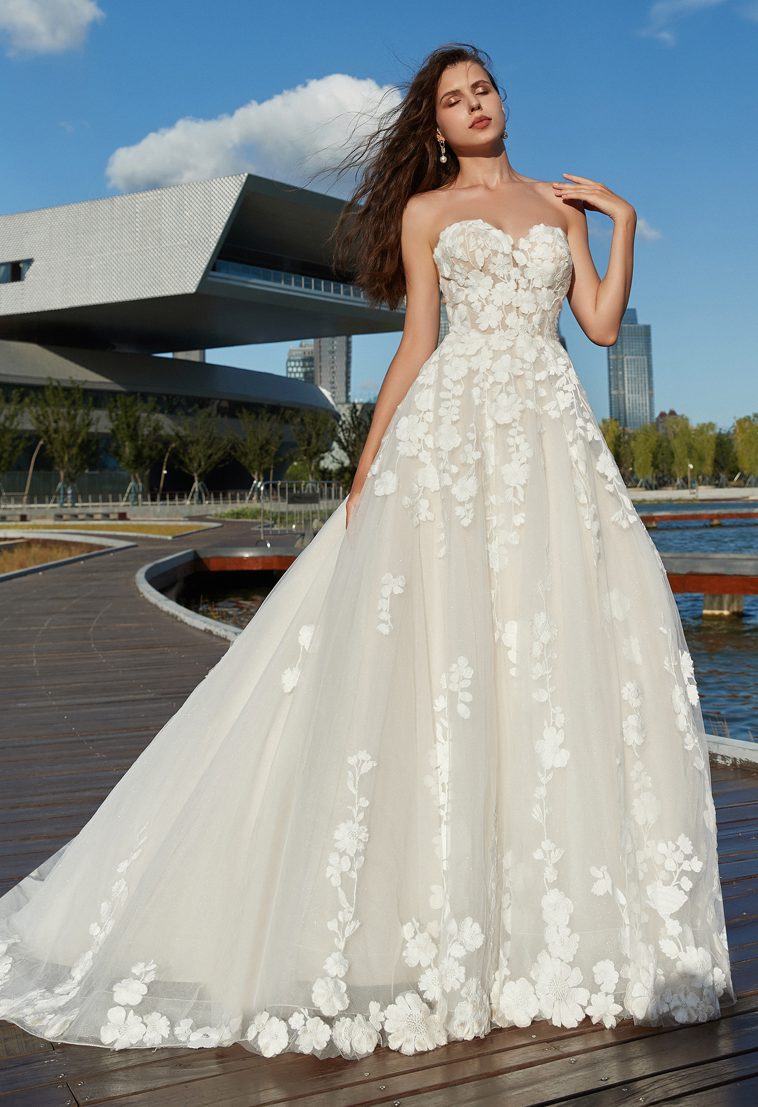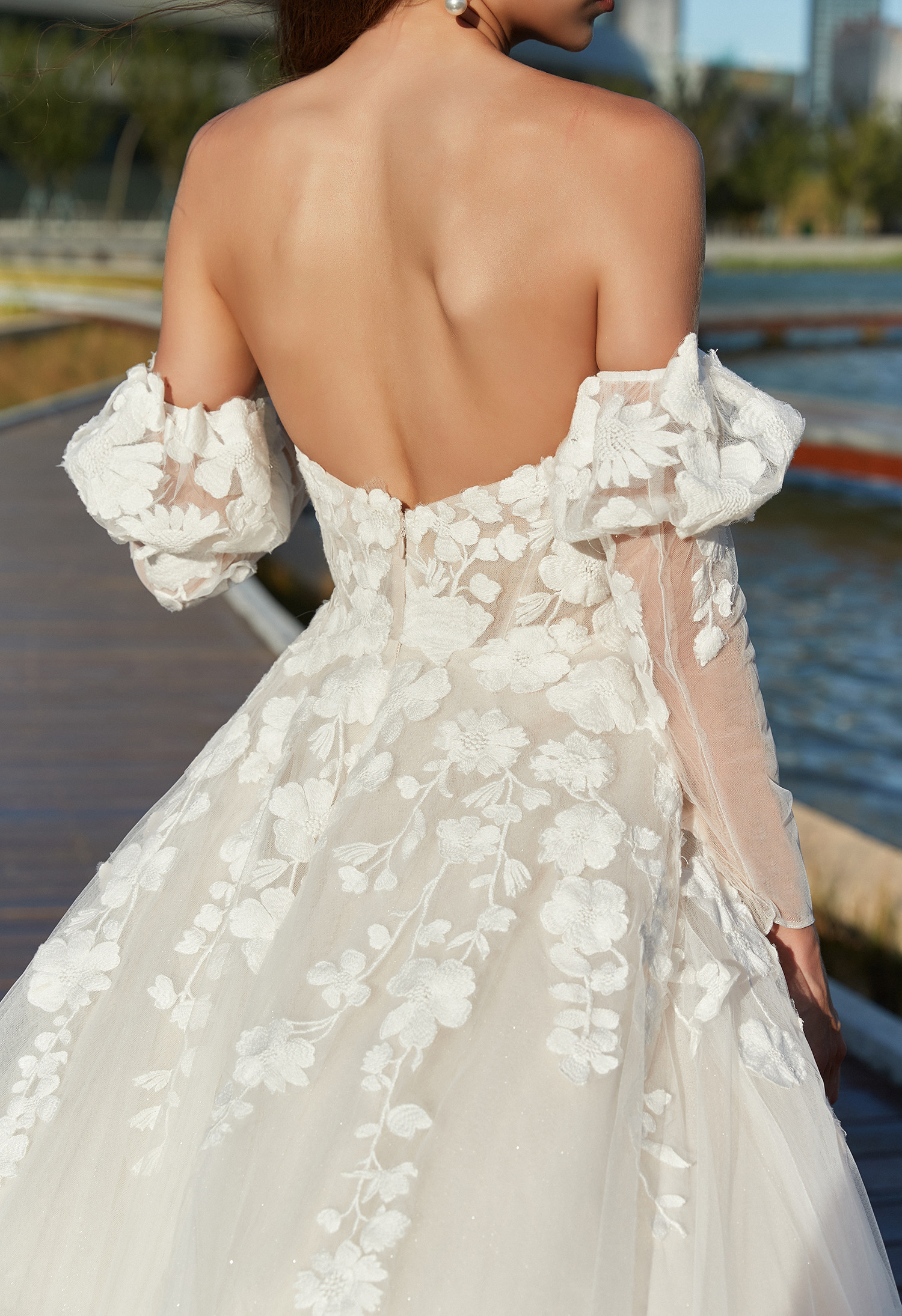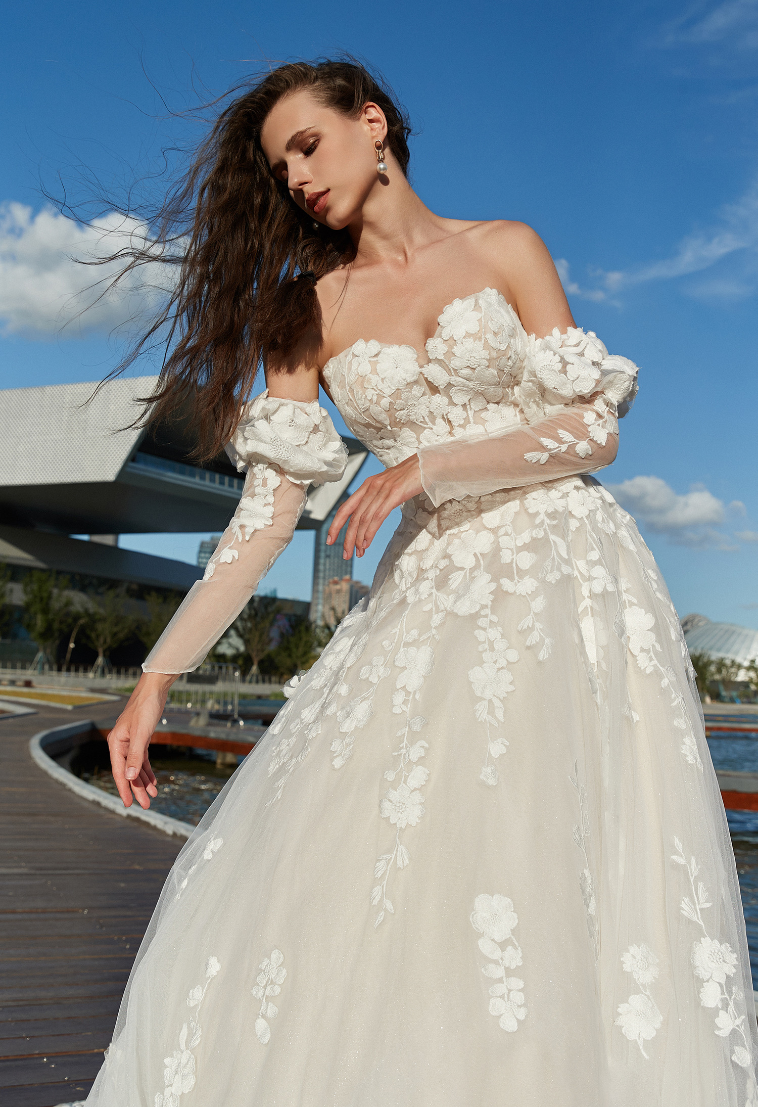 Strapless A-Line Floral Wedding Dress with Detachable sleeves