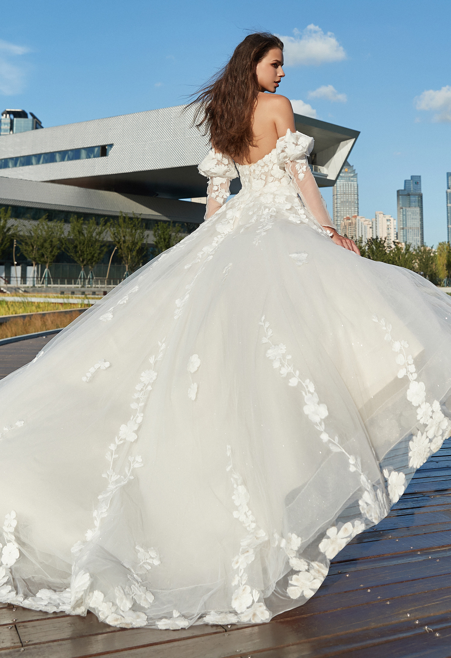 You’re a born romantic.It was your interest in this unique floral A line wedding gown – lush with illusion, perfect for whimsical bridal portraits.The delicate floral frosted embroidered lace and detachable long pouf sleeves adds a fairytale effect to the gown.