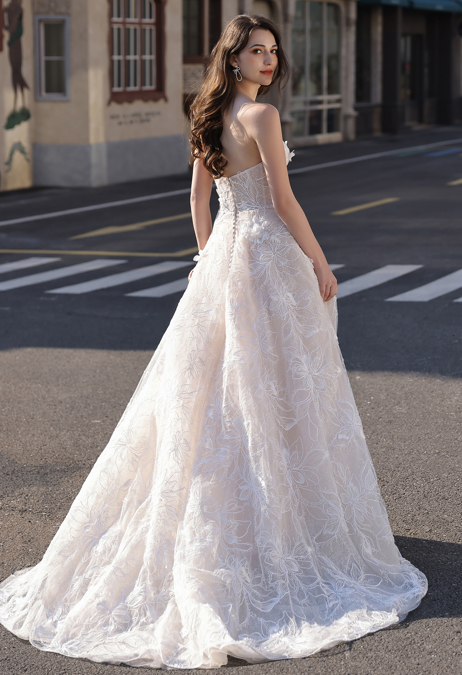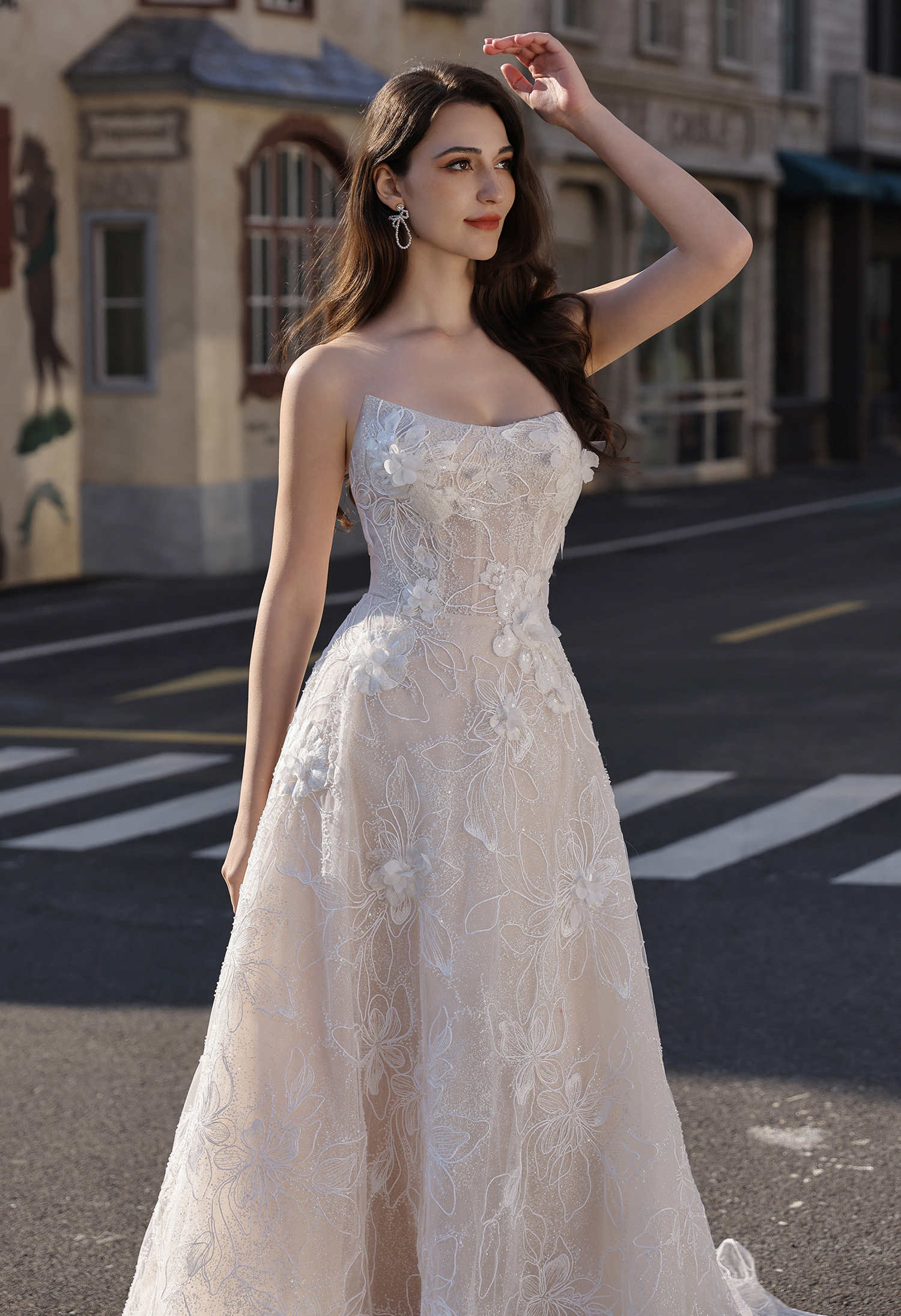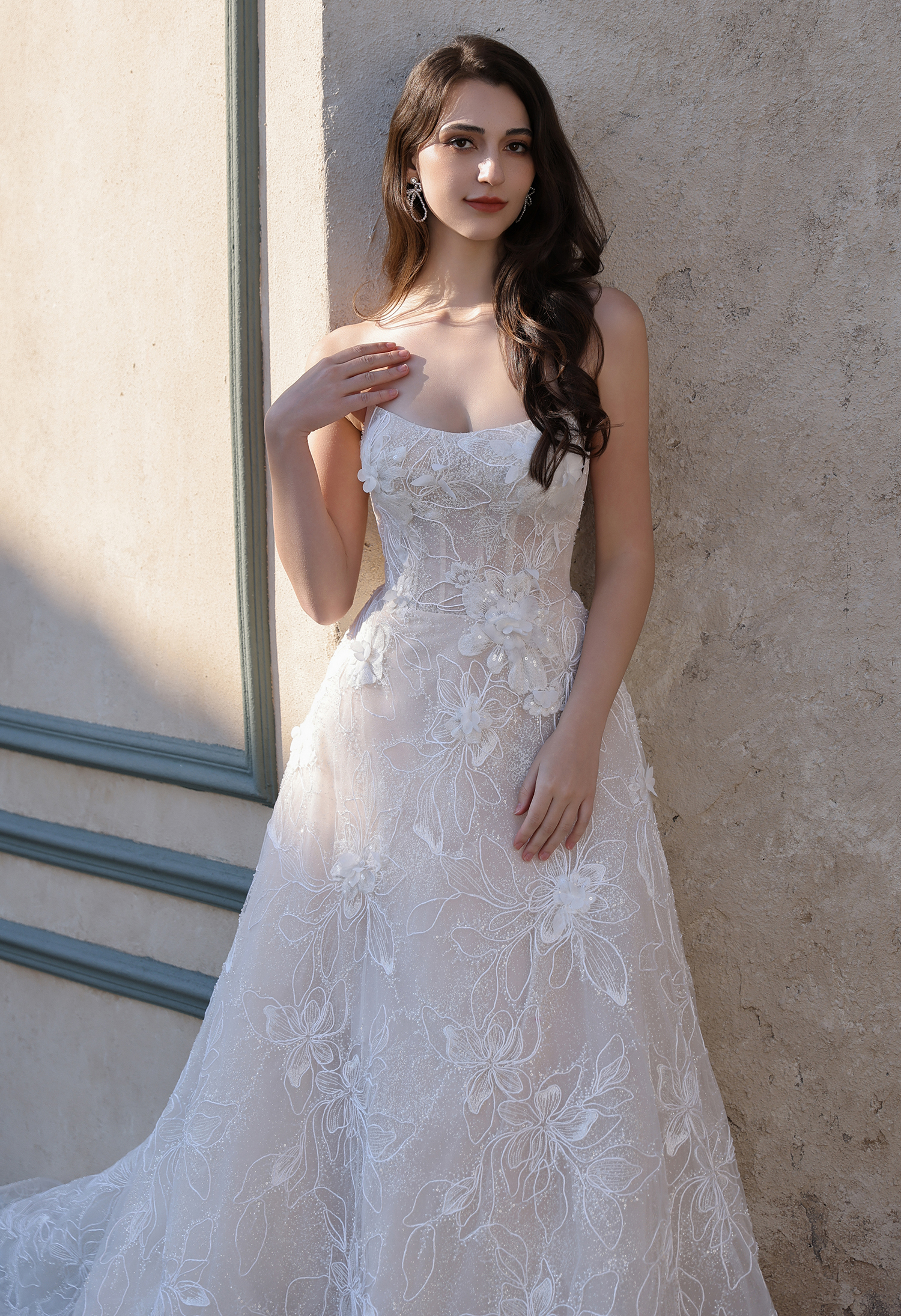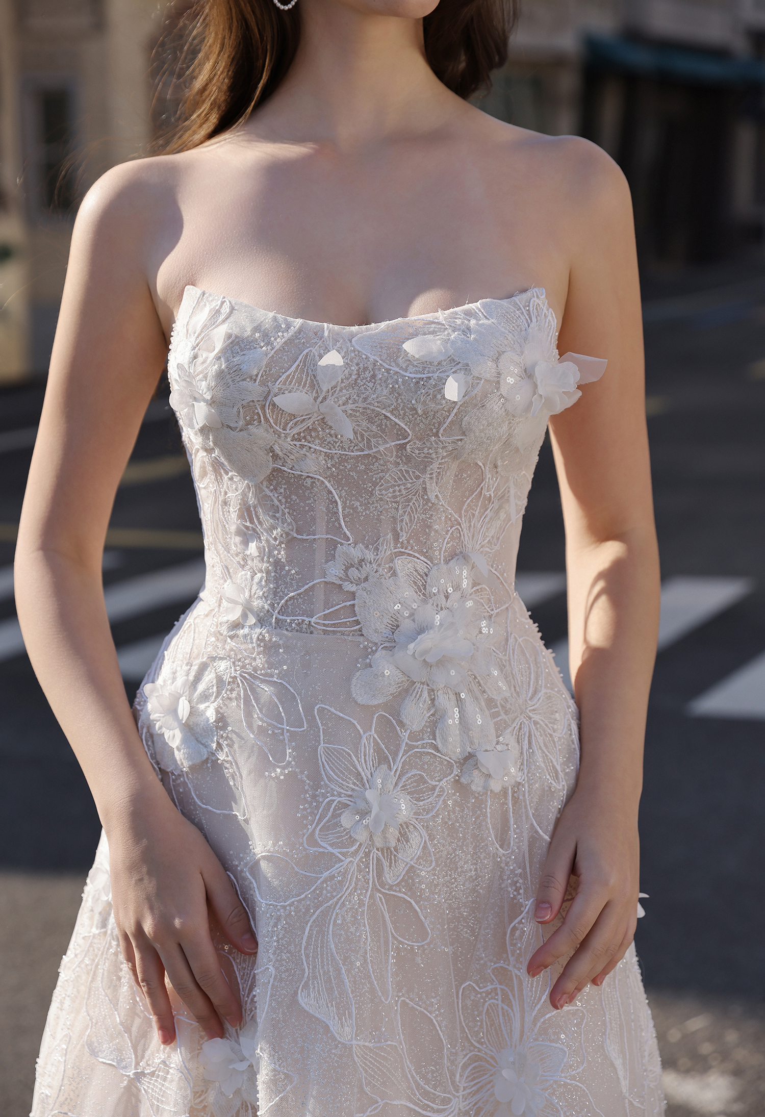 The unlined eyelet bodice embraces subtle sheerness, while the skirt is adorned with delicate floral lace,each motif brought to life through raised, textured stitching that catches light with understated grandeur. Intricate 3D floral appliqués elevate the gown’s ethereal, romantic allure, blending soft transparency with tactile luxury.
