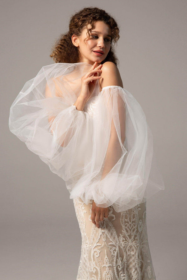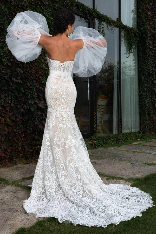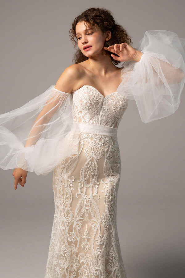 Unveil your beauty in the captivating JULIA wedding dress! This sexy trumpet-mermaid gown features a sweetheart neckline, intricate appliqués, and a lace-up corset. With detachable puff off-the-shoulder sleeves, it’s perfect for hotel, church, garden, or hall weddings!