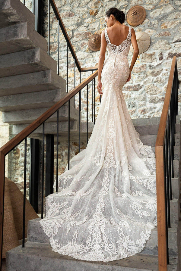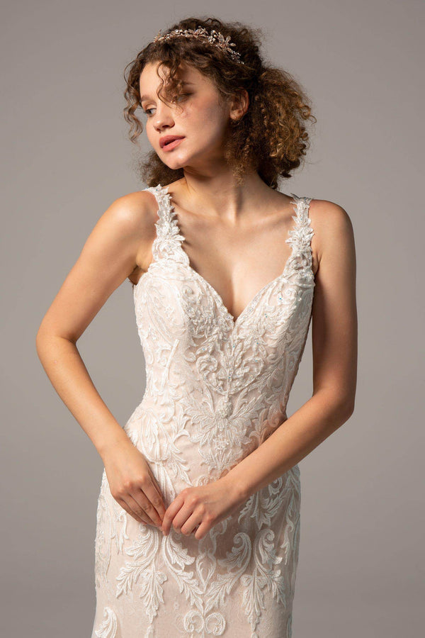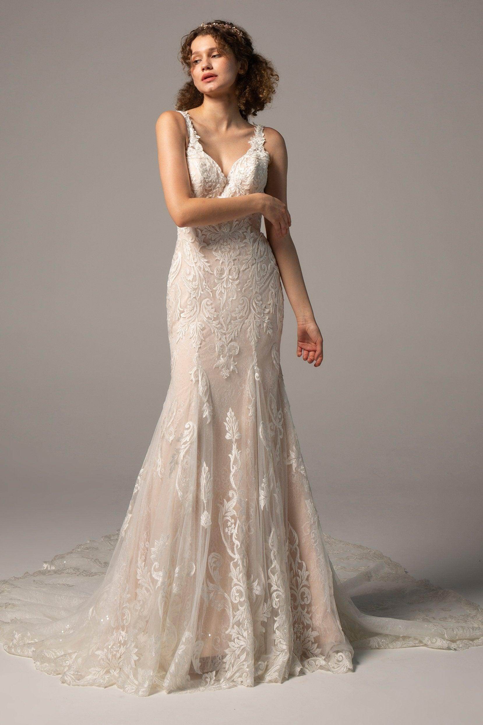 The stunning LISA wedding dress, with its figure-hugging trumpet silhouette and intricate appliques, is designed to turn heads. Perfect for hotel, church, garden, or hall weddings, it features a V-neck, cathedral train, and luxurious tulle. Available in plus size, petite, and custom options for every bride.