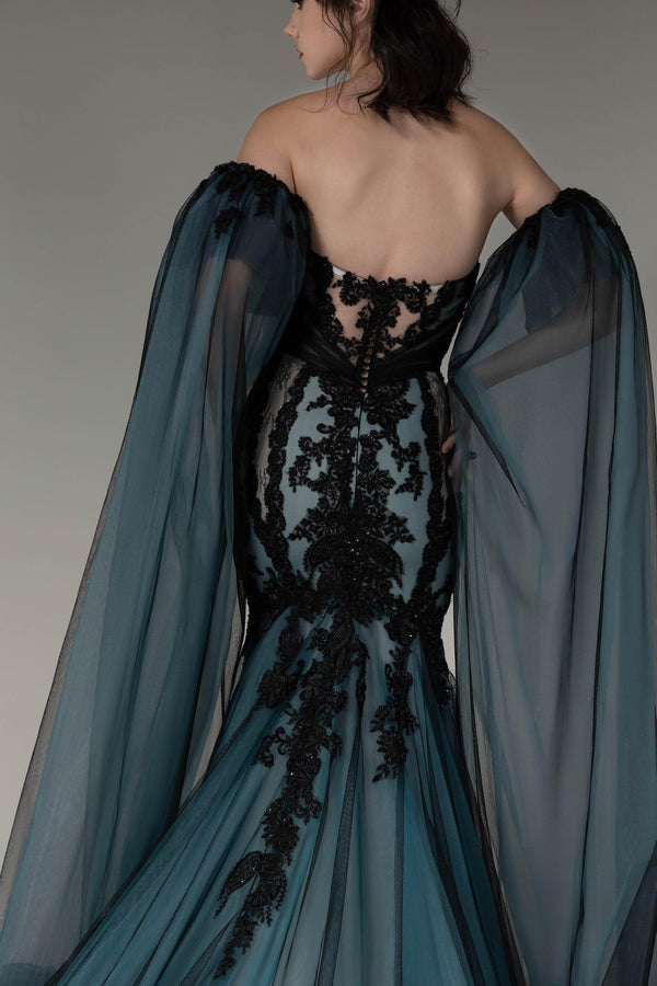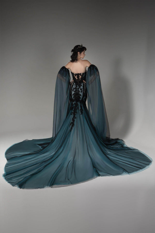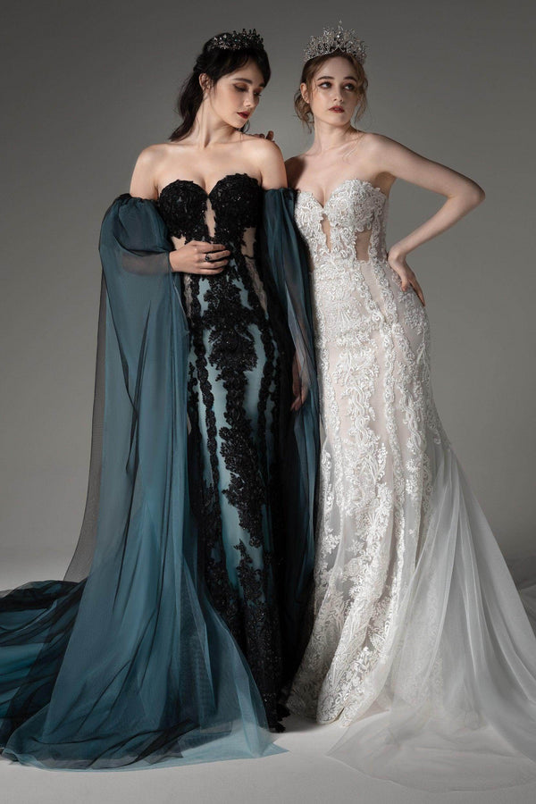 Introducing a visionary Black/Midnight Blue wedding gown featuring a heart-shaped neckline with a keyhole detail. Embellished with exquisite Appliques, it exudes opulence. The detachable off-shoulder sleeves offer versatility, while the tulle trumpet-mermaid silhouette boasts a luxurious train.Embrace Gothic innovation