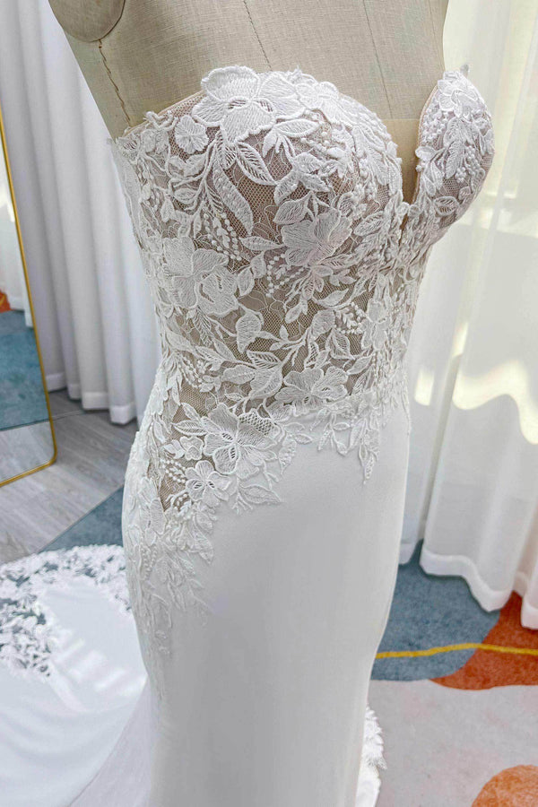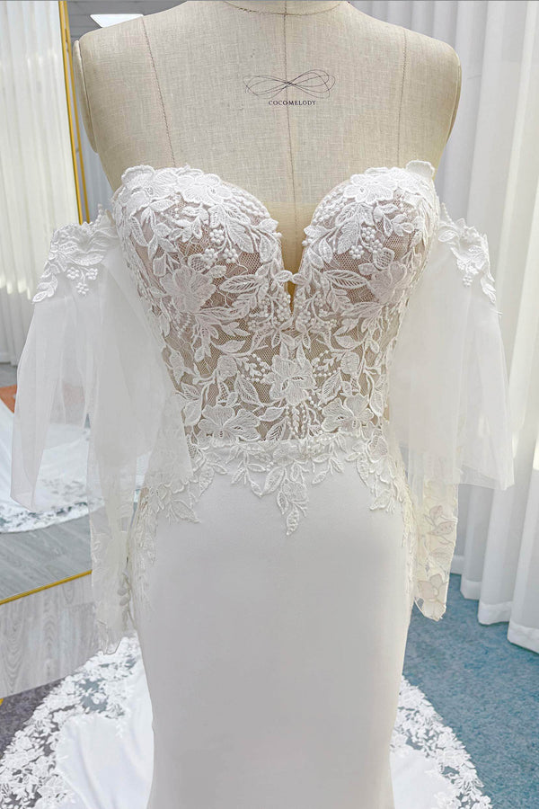 strapless sweetheart neckline with a subtle V-detail, adorned with delicate cotton lace for an elegant and breathable upper body. Crafted from luxurious satin, it boasts a Trumpet-Mermaid silhouette. The ensemble includes detachable bubble sleeves for versatility, with the Court Train edge trimmed in cutout lace.