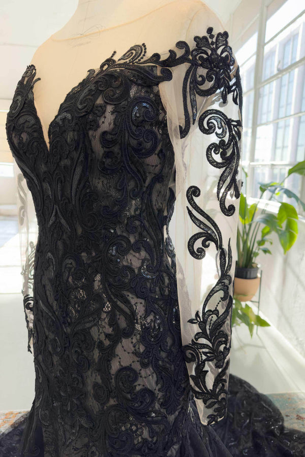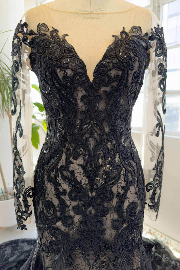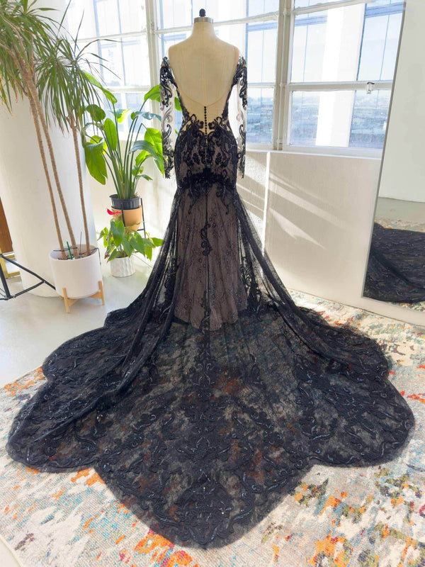 Indulge in Gothic elegance with this Black/Medium Nude bridal gown. Its illusion off-shoulder, long-sleeved design exudes timeless allure, while the open back adds a hint of drama. Intricate Appliques adorn the tulle trumpet-mermaid silhouette, creating a captivating fusion of sophistication and mystique.