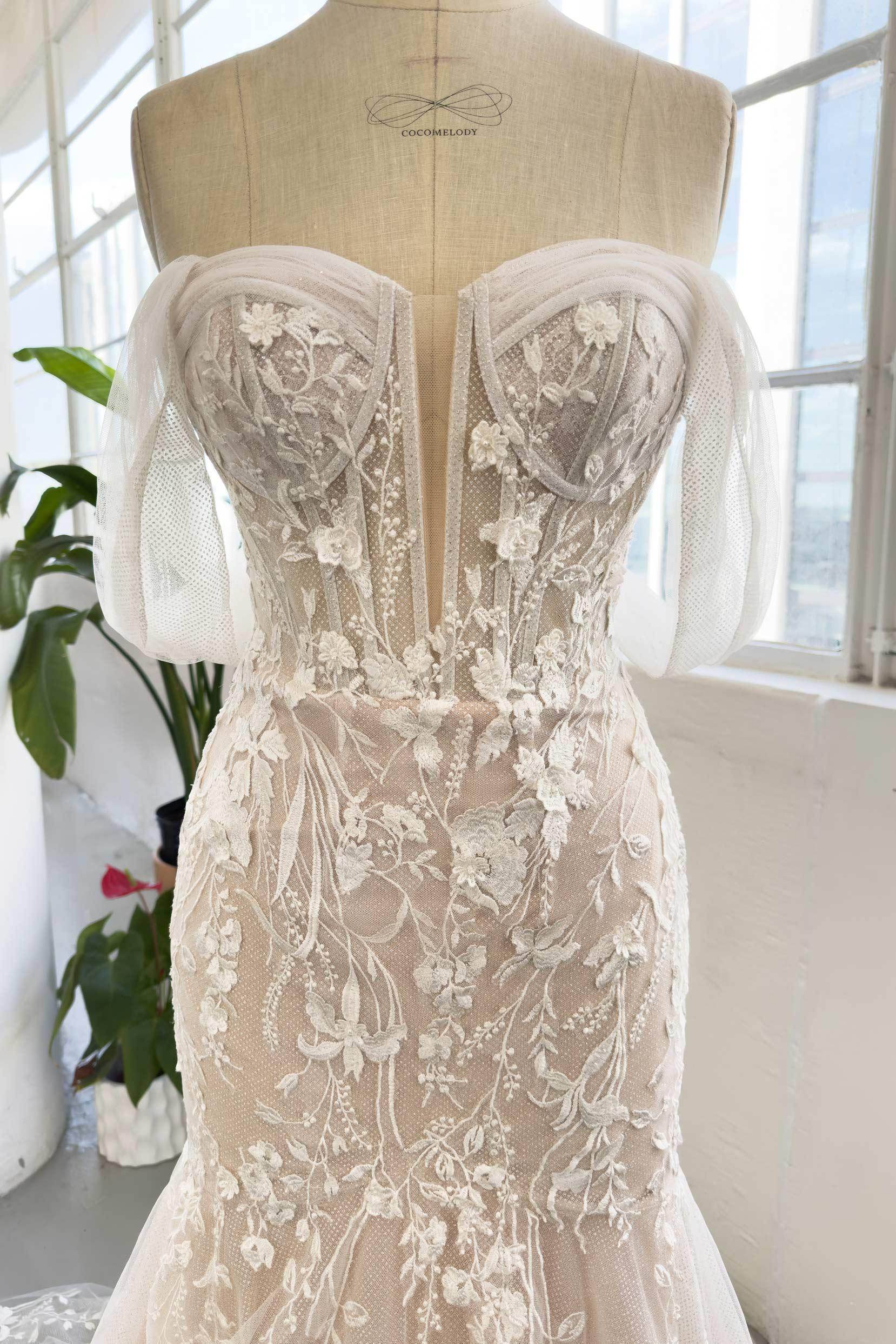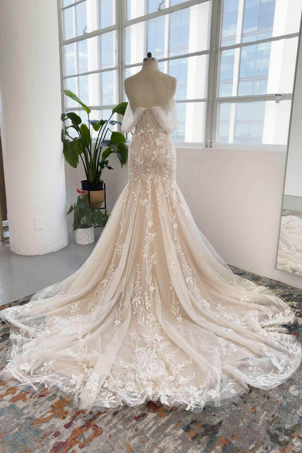 Step into elegance with the stunning MAKENA wedding dress by Classic! Featuring exquisite ivory/nude appliques and beading, this off-the-shoulder trumpet silhouette is perfect for hotel, church, garden, or hall weddings. Customize your sparkle today!
