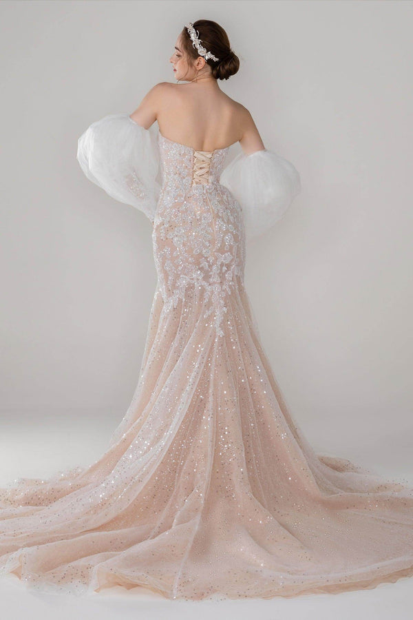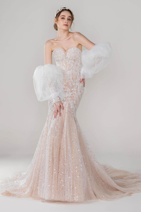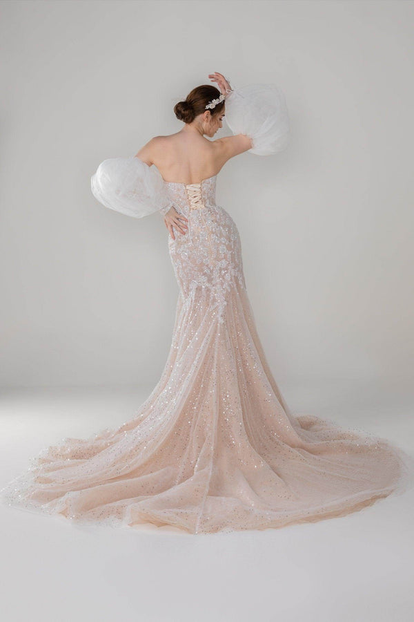 Unveil the AMALIA wedding dress: a stunning that shines in any setting—from beach to ballroom. With a sweetheart neckline, delicate appliques, and a lace-up corset, this ivory/nude gown is perfect for every celebration, ensuring you radiate elegance wherever you go.
