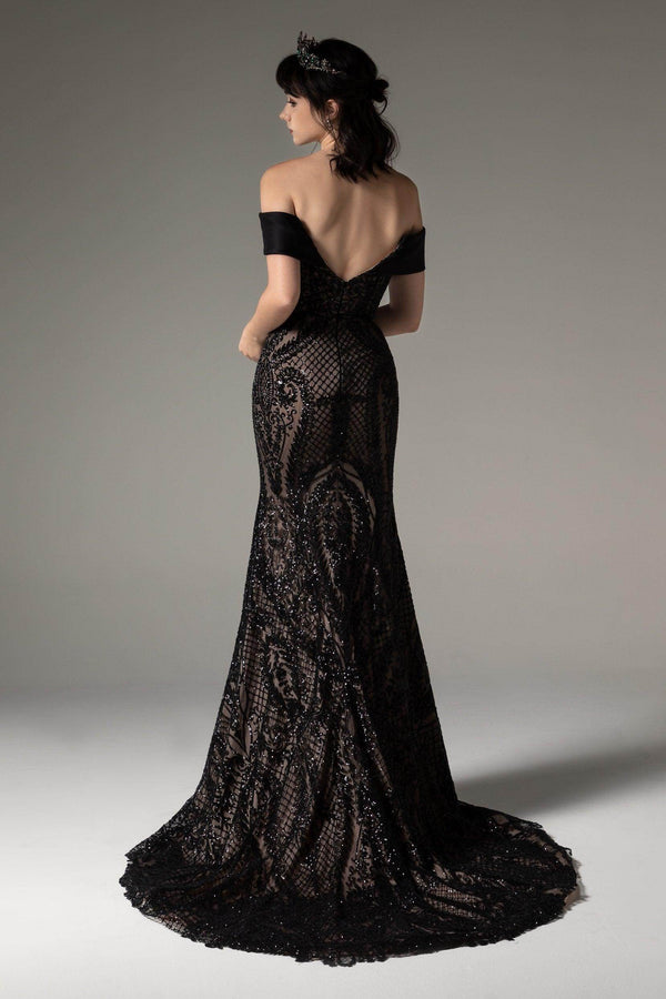 Introducing a chic Black/Nude wedding gown featuring a satin off-shoulder neckline meeting opulent sequined lace. The V-back adds allure to the tulle trumpet-mermaid silhouette, exuding elegant Gothic charm. Complete with a sweep train, this ensemble epitomizes sophistication.